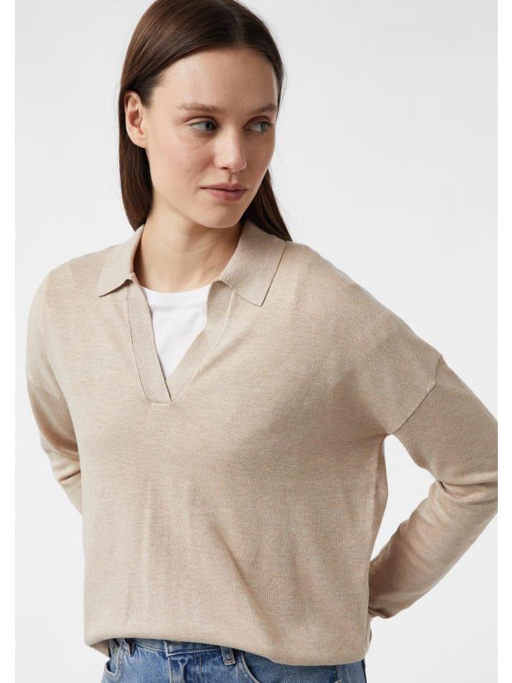 Откройте для себя этот элегантный свитер тонкой вязки из высококачественной вискозной смеси со стильным воротником-поло и V-образным вырезом. Свободный крой со спущенными плечами обеспечивает повседневный комфорт, а мягкий эластичный материал приятен на ощупь. Ребристые манжеты на длинных рукавах и подоле добавляют модные акценты. Идеально подходит для расслабленных дней в офисе или уютных вечеров - универсальный и простой в стилизации.