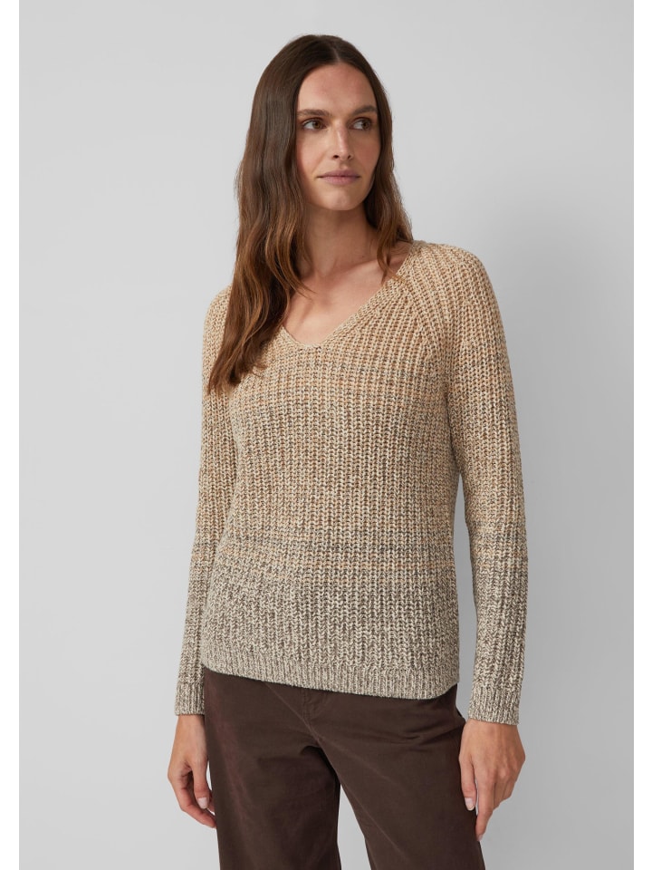 Ваш новый вязаный свитер с V-образным вырезом и цветовым градиентом станет вашим уютным спутником в спокойные дни! Мягкий материал на основе хлопка приятно согревает и дарит приятную мягкость коже. Длинные рукава и ребристые манжеты идеально сочетаются с вашими любимыми джинсами - будь то для кофе с друзьями или уютного вечера дома.