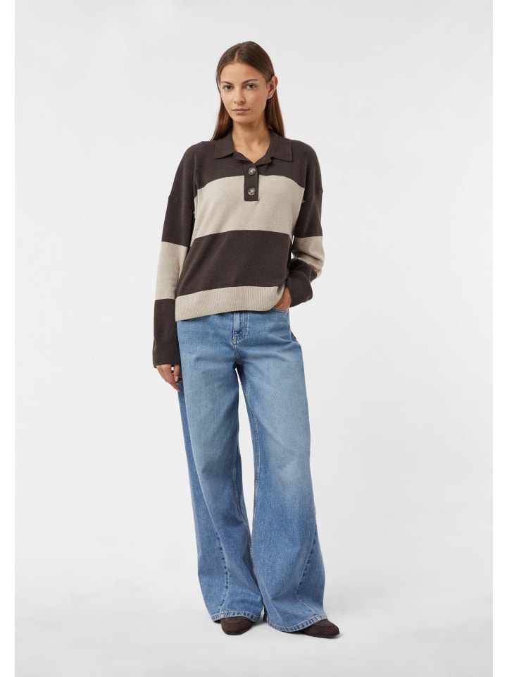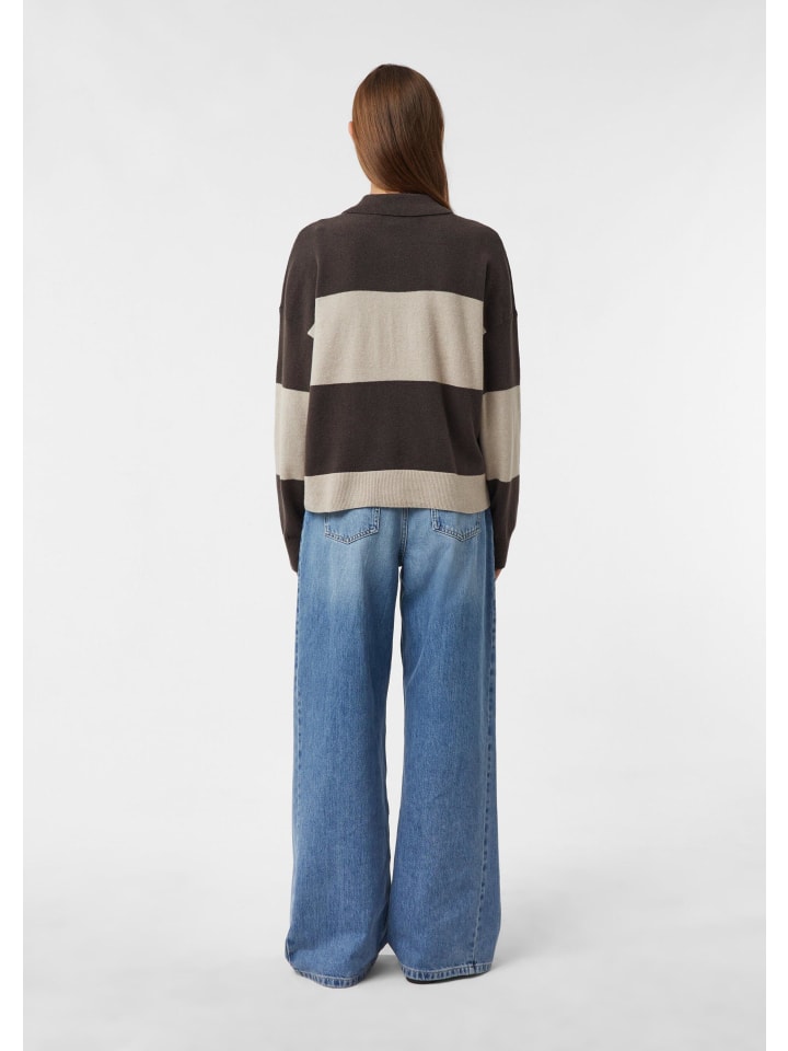 Этот элегантный трикотажный свитер, неподвластный времени, отличается свободным кроем. Мягкая хлопковая смесь и спущенные плечи гарантируют максимальный комфорт. Классический воротник-поло и нежный полосатый рисунок добавляют нотку современности. Эластичная ткань и практичные ребристые манжеты делают этот свитер универсальным аксессуаром для самых разных случаев.
