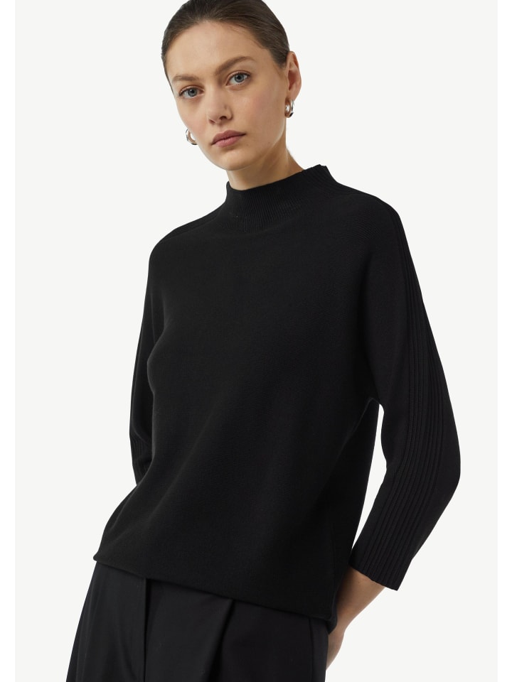 Очаровательный свитер тонкой вязки: этот свитер стандартной кроя с рукавами 3/4 и элегантным воротником-стойкой добавит женственности вашему образу. Ребристые детали создают тонкие акценты и выгодно подчеркивают фигуру. Универсальный и легко комбинируемый, он идеально подходит для создания многослойного образа в прохладную погоду или станет стильным акцентом в офисе.