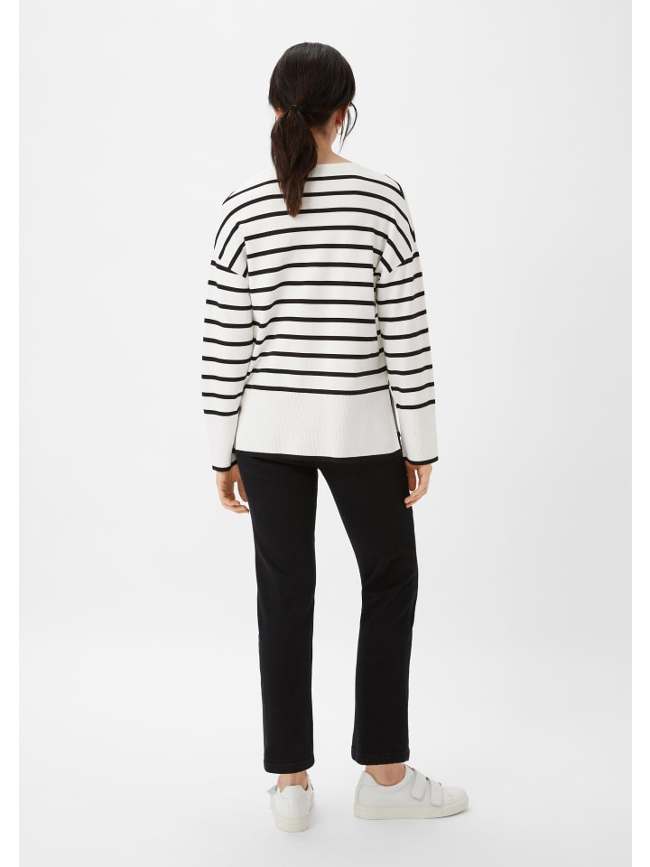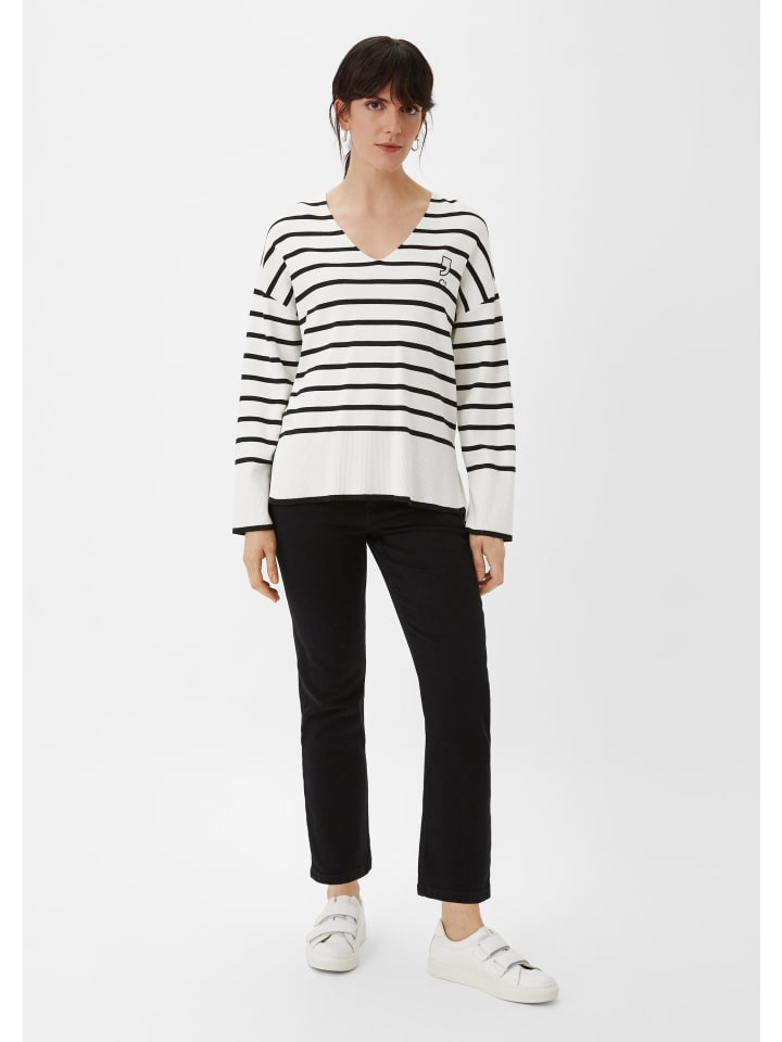 Новый взгляд на вязаный свитер: этот свитер тонкой вязки впечатляет своим полосатым рисунком и мягкостью. Классический крой и длинные рукава с ребристыми манжетами обеспечивают комфорт, а V-образный вырез создает женственный силуэт. Носите его с джинсами в непринужденном стиле или создайте вечерний образ, добавив несколько слоев.