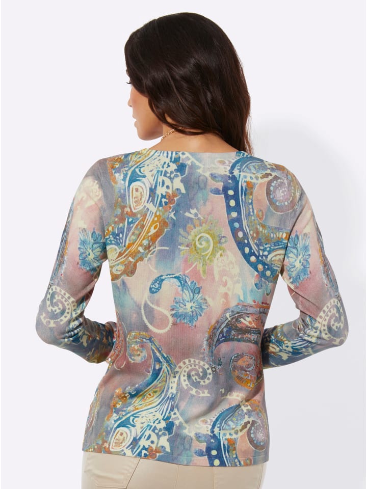 Яркие цвета для стильных модниц! Тонкий трикотажный свитер с эффектным узором пейсли, круглым вырезом и длинными рукавами. Идеальная посадка по фигуре. Изготовлен из вискозы Lenzing ECOVERO.