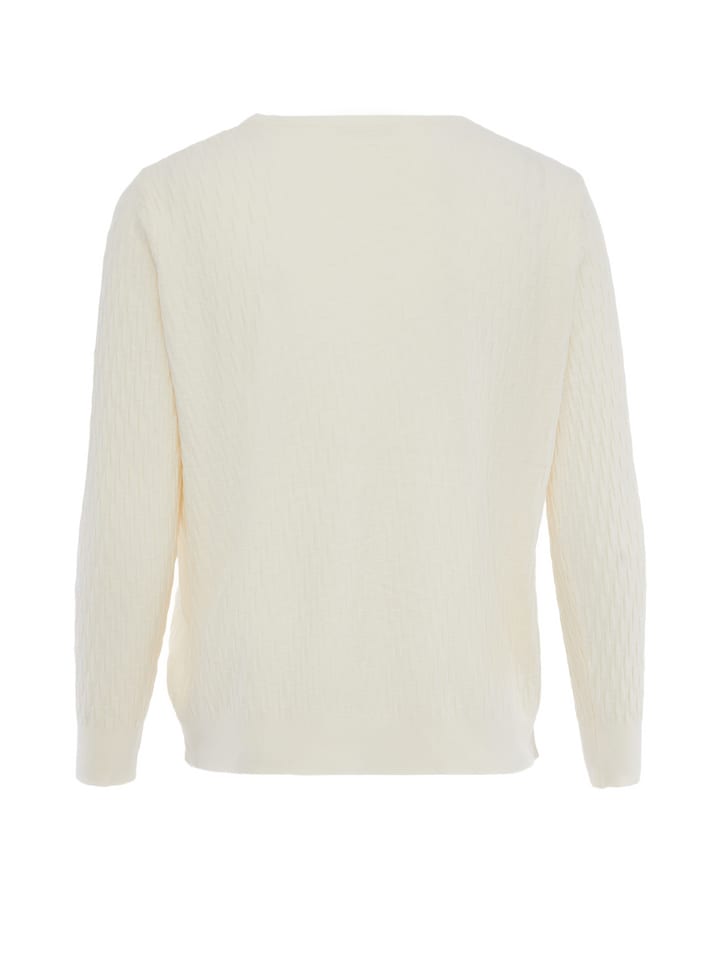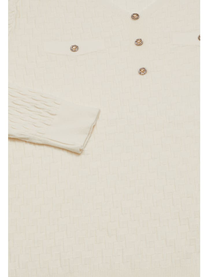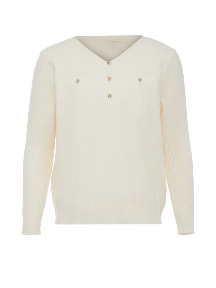 Украсьте свой гардероб этим изысканным свитером с длинными рукавами и очаровательным фактурным узором. V-образный вырез и декоративные пуговицы спереди добавляют элегантности, а небольшие плоские карманы с пуговицами в тон добавляют очарования. Тонкий рубчик по низу, манжетам и вырезу обеспечивает плотную, но комфортную посадку, делая этот свитер идеальным выбором для тех, кто ищет непринужденную элегантность в своем образе. Этот свитер, разработанный совместно с Caneva, сочетает в себе классический стиль и современный дизайн.