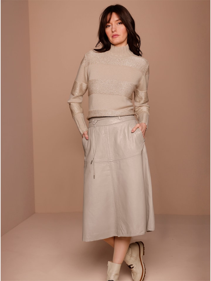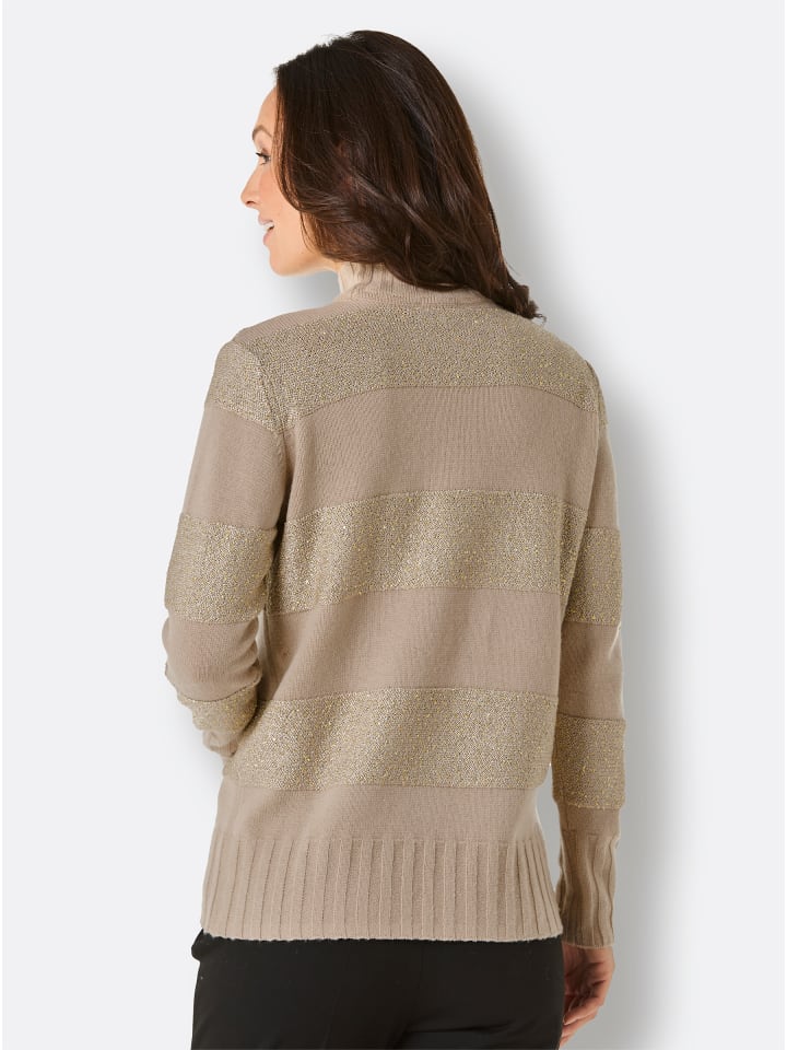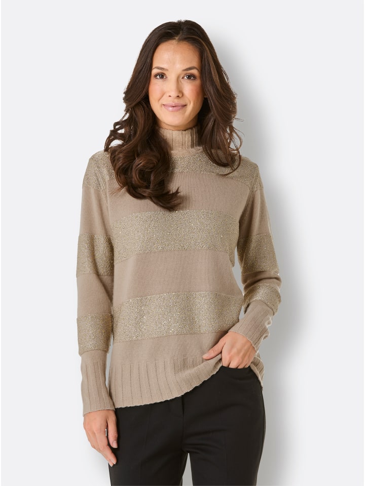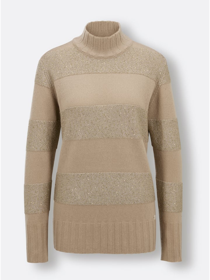 Этот свитер из мериносовой шерсти и кашемира невероятно теплый и легкий. Эффектные полоски чередуются с гладкими участками и полосками из сверкающей пайеточной пряжи. Идеальная посадка. Двойные манжеты в рубчик украшают воротник-стойку, длинные рукава и подол. Перламутровый логотип завершает образ.