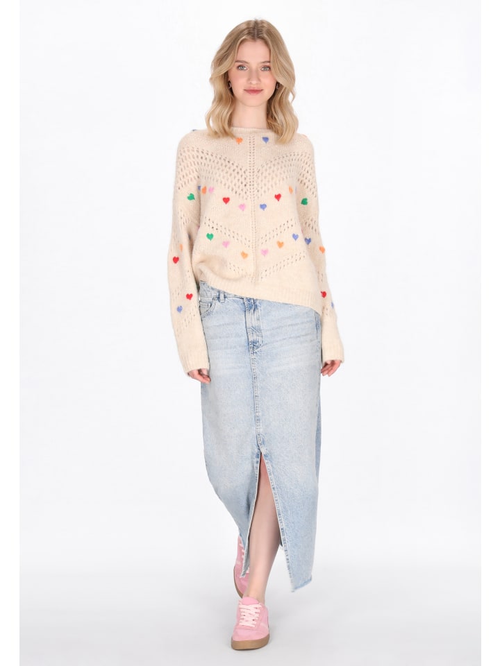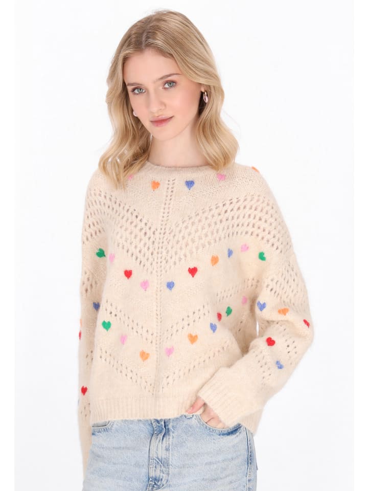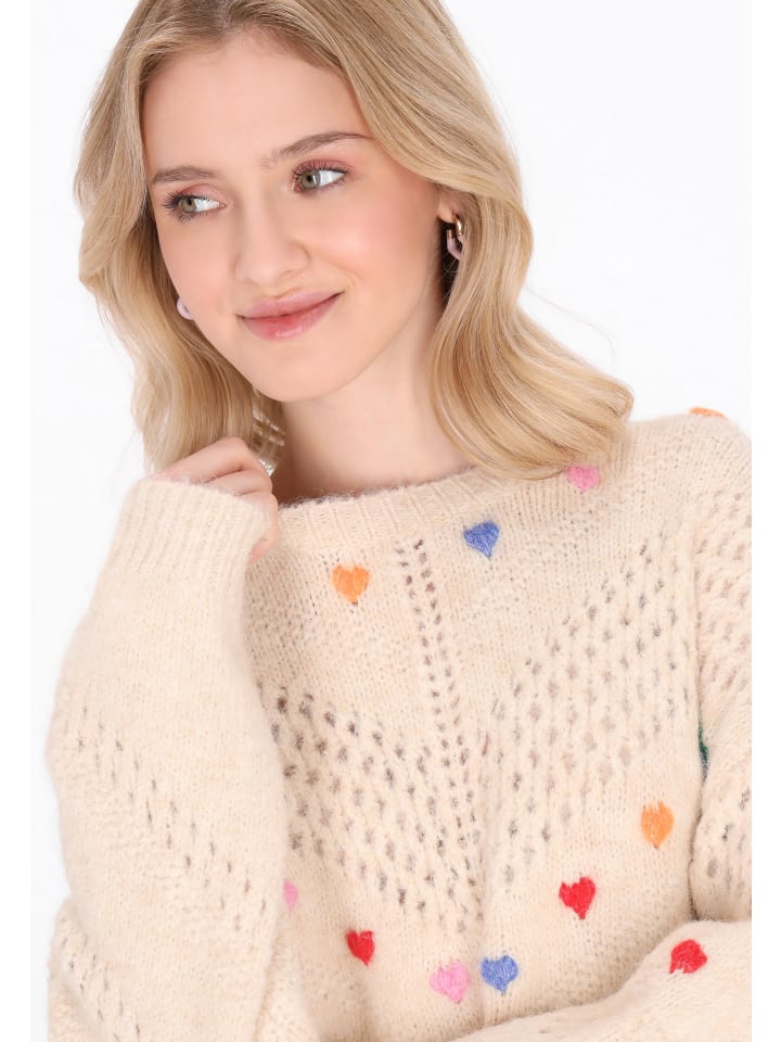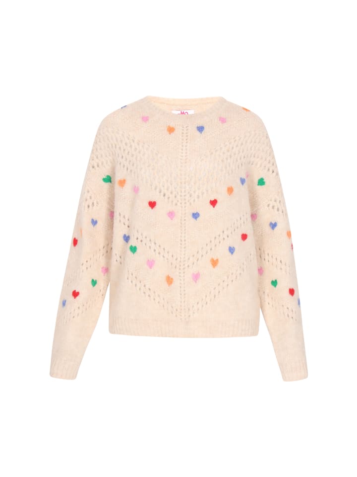 Этот милый свитер из коллекции Young Fashion - идеальный выбор для прохладных дней - мягкий, стильный и полный девичьего очарования. Свободный крой и спущенная линия плеча придают ему непринужденный, модный вид. Свитер имеет классический круглый вырез горловины, длинные рукава и выполнен из приятного на ощупь трикотажного полотна. Ажурный узор добавляет ему легкости, а вышитые сердечки подчеркивают его девичий характер. Он прекрасно подойдет для повседневной носки - с джинсами, юбками или платьями.