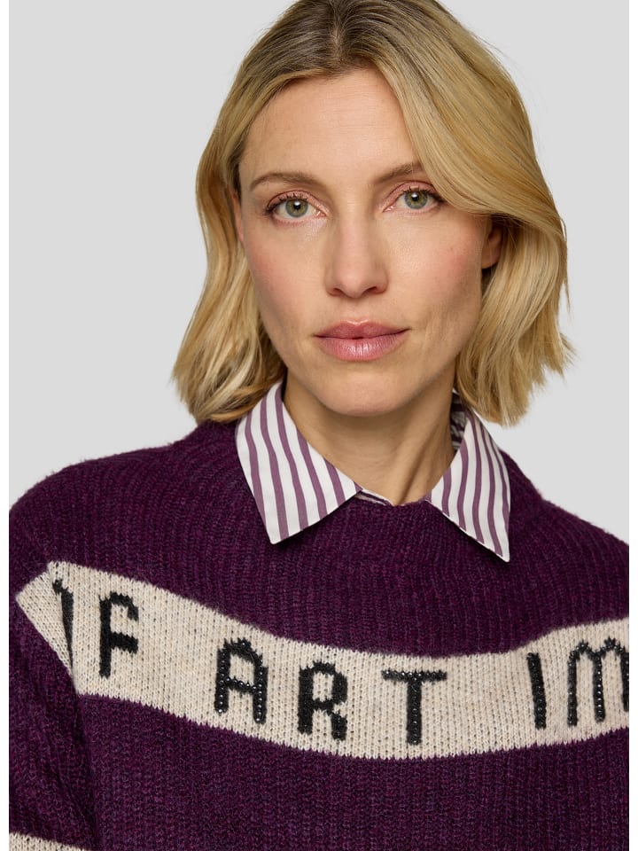 Этот уютный вязаный свитер сочетает в себе привлекательный дизайн и комфорт. Широкие контрастные полосы с вышитыми надписями создают современный образ. Свободный крой, классический круглый вырез горловины и приятная мягкая пряжа с добавлением шерсти альпаки делают этот свитер идеальным спутником для прохладных дней.