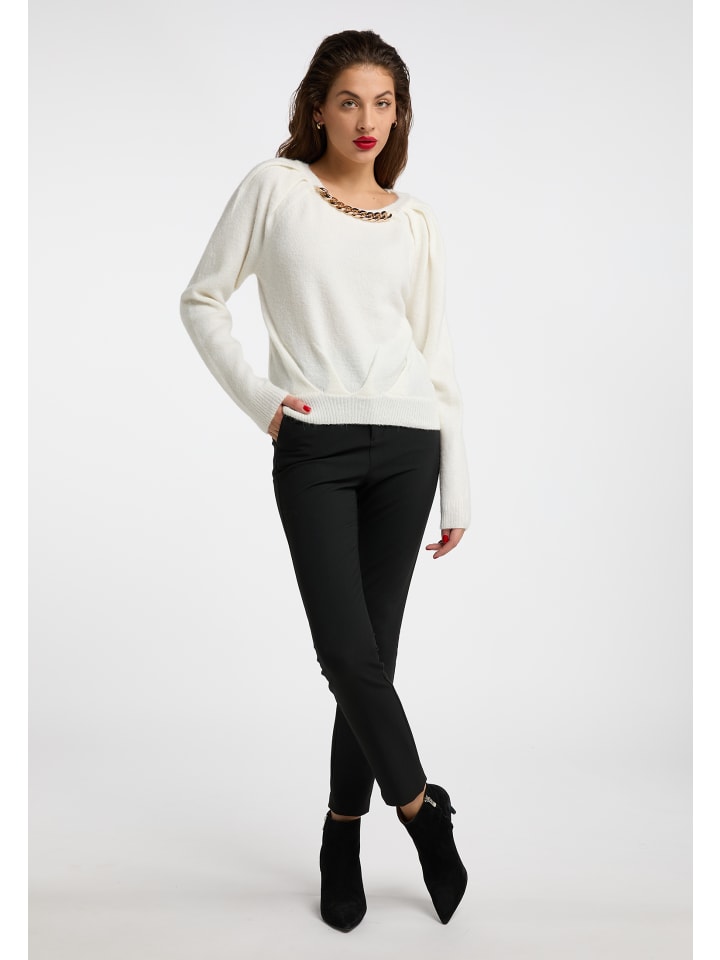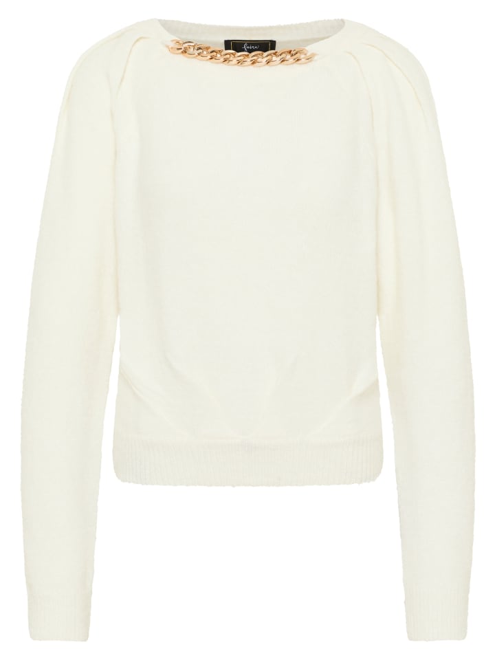 Украсьте свой зимний гардероб этим свитером от Faina. Элегантный дизайн выполнен из мягкой смесовой пряжи и дополнен складками на плечах и подоле. Декоративная золотистая цепочка на вырезе и рукава реглан добавляют нотку шика.