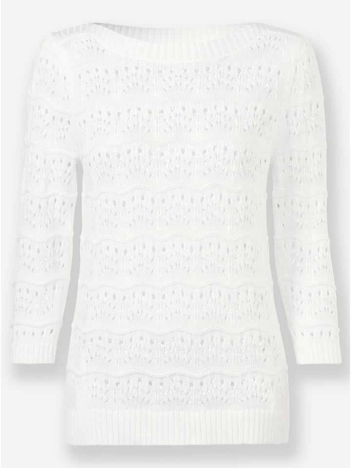 Удобный хлопковый свитер легкой волнистой вязки с ажурным узором по всему периметру. Ребристая отделка по вырезу «лодочка» и до плеч. Ребристая отделка манжет рукавов 3/4 с легкой сборкой на плечах и подоле. В поддержку инициативы «Хлопок, сделанный в Африке».