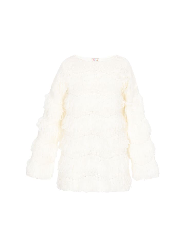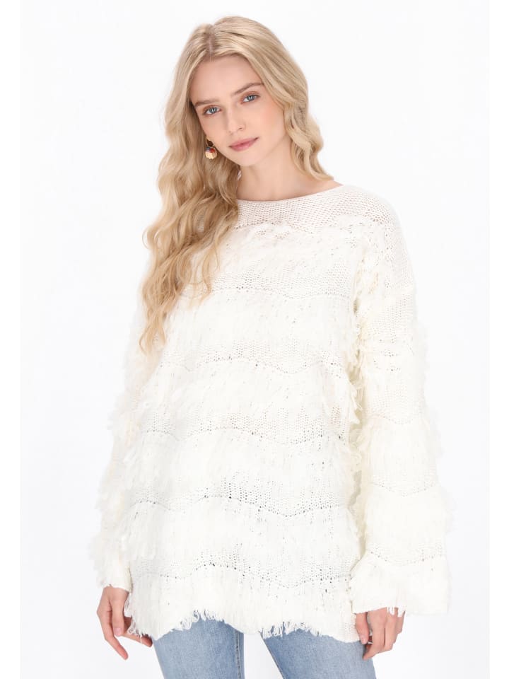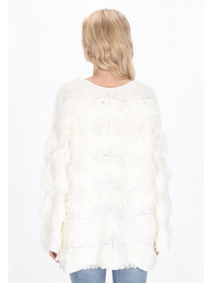 Этот свитер из коллекции Boho - воплощение комфортного стиля с характером. Свободный крой с широкими рукавами и спущенной линией плеч обеспечивает свободу движений и исключительный комфорт. Вырез «лодочка» деликатно обнажает плечи, а трикотажная структура с бахромой и фактурным узором привлекает внимание и добавляет образу нотку этнического колорита. Идеально подходит для любителей этнического стиля, ценящих нестандартные формы и повседневный комфорт.