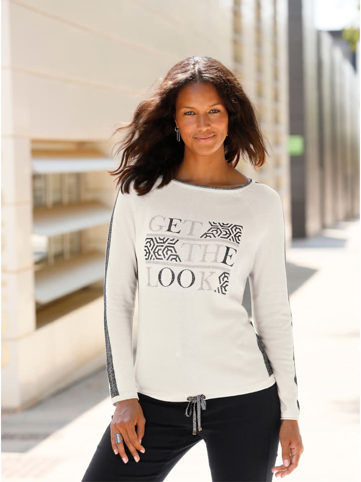 Этот пуловер из мягкой, эластичной пряжи тонкой вязки привлекает внимание благодаря мерцающей надписи, украшенной стразами. Серебристая мерцающая пряжа украшает подвернутый край выреза лодочкой и длинные рукава реглан. Контрастные боковые полосы создают привлекательный силуэт вдоль боковых швов и рукавов. Подол затягивается шнурком и имеет блестящую завязку. Сложная вязка обеспечивает идеальную посадку. Соответствует инициативе «Хлопок, сделанный в Африке».