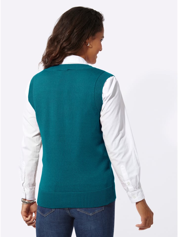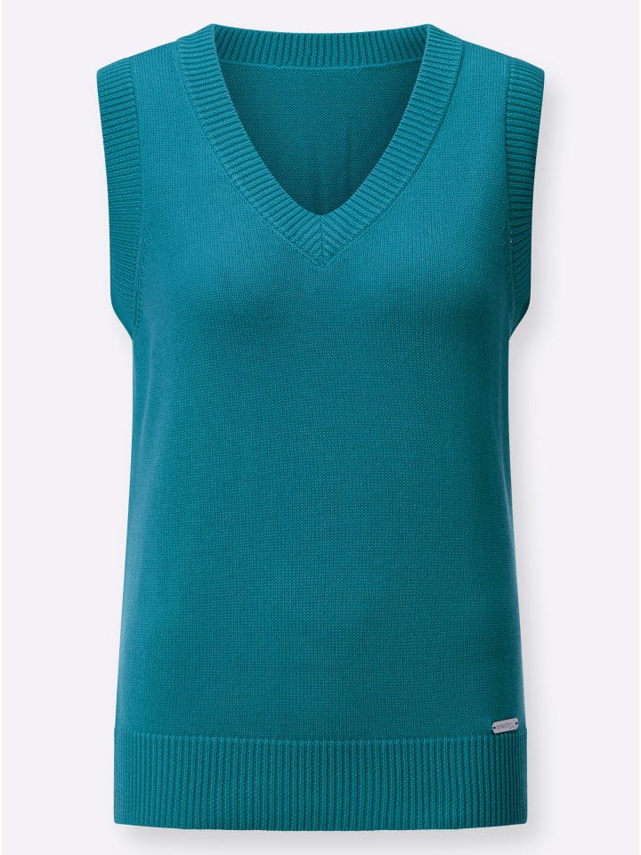 Универсальный жилет из приятного мягкого смесового материала. Визуально удлиняющий V-образный вырез, проймы и подол отделаны резинкой. Связан точно по фигуре. Соответствует инициативе «Сделано в Африке» (Cat. Made in Africa).