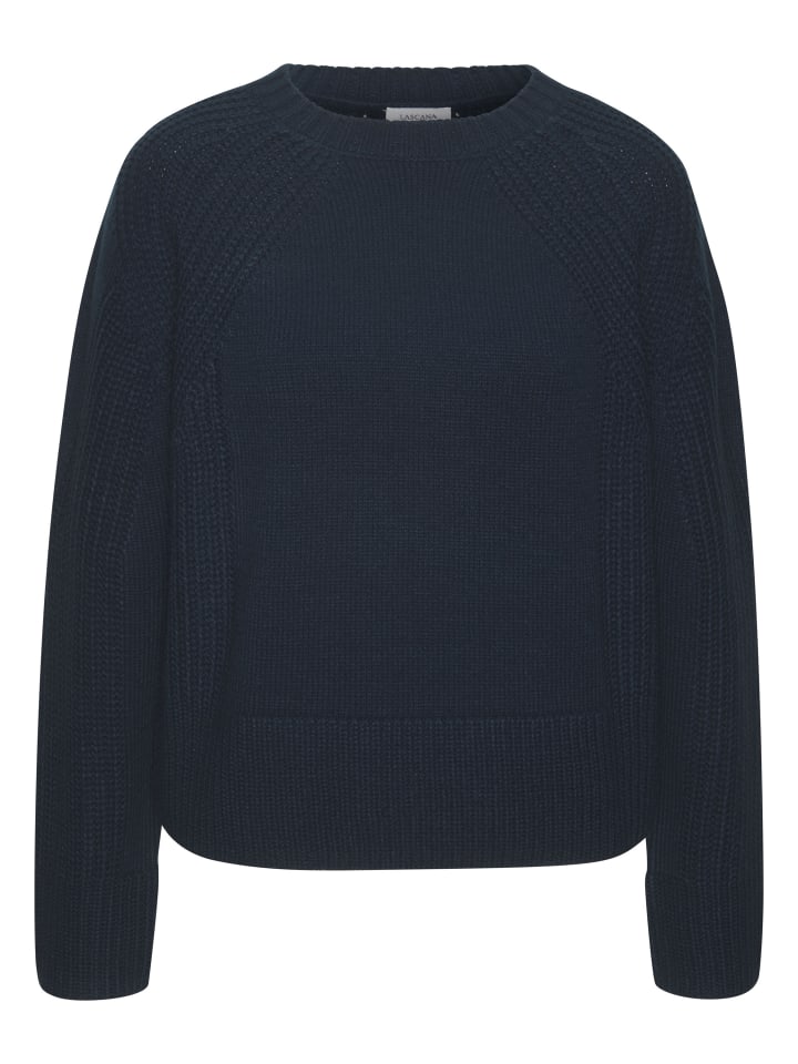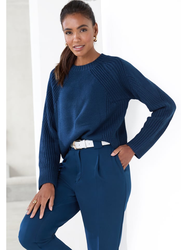 Однотонный трикотажный свитер от Lascana с круглым вырезом. Длинные рукава реглан для удобной посадки. Ребристый подол. Мягкий смешанный материал.