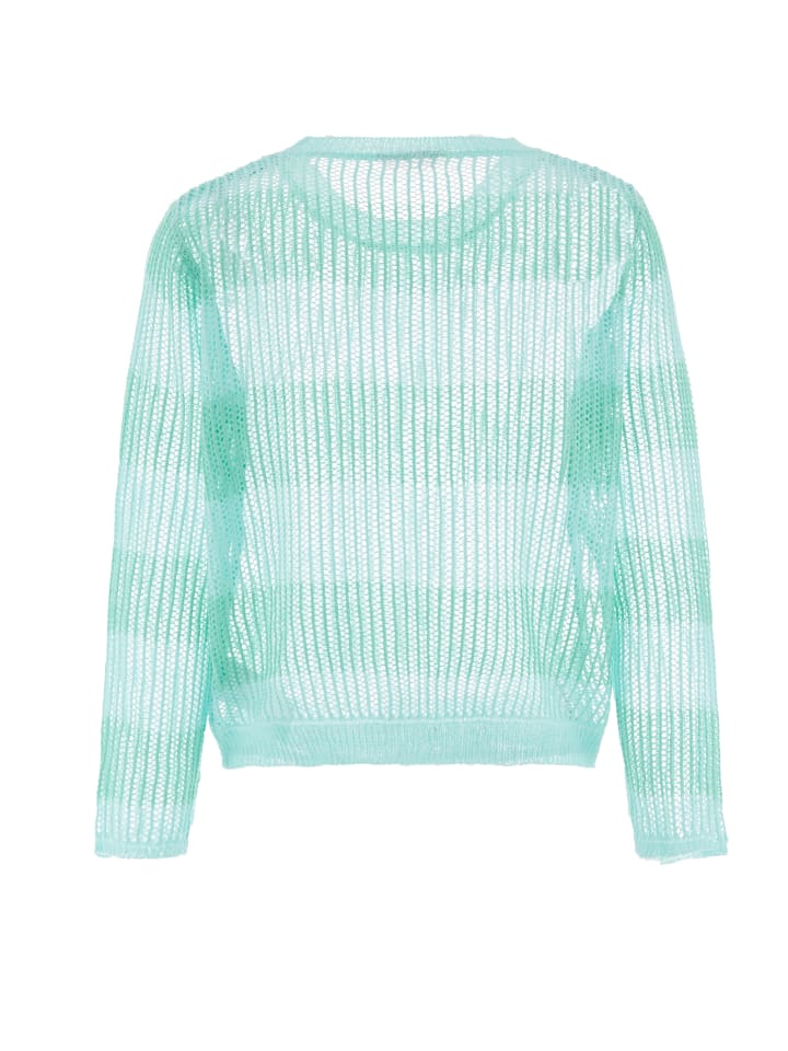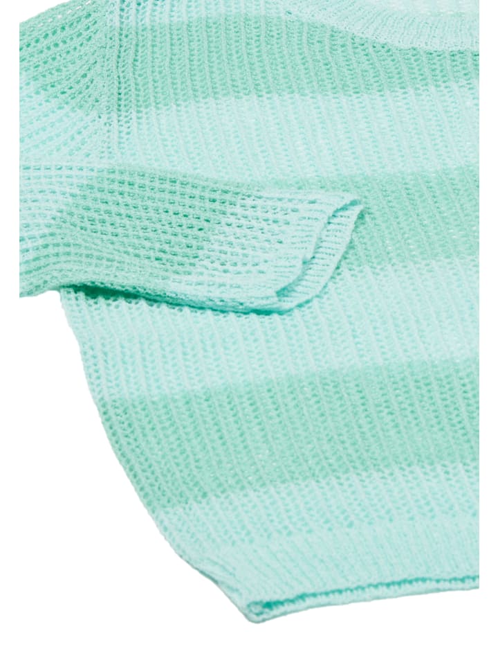 Этот свитер с круглым вырезом выполнен из прозрачной ткани ажурной вязки с горизонтальными полосками разной ширины по всей длине изделия. Ребристый вырез горловины, манжеты и подол обеспечивают структурированную посадку на фоне свободного и воздушного трикотажа. Изготовленный из легкой ткани для комфортной носки, этот свитер, разработанный совместно с IMMY, сочетает в себе классический стиль и современный дизайн.