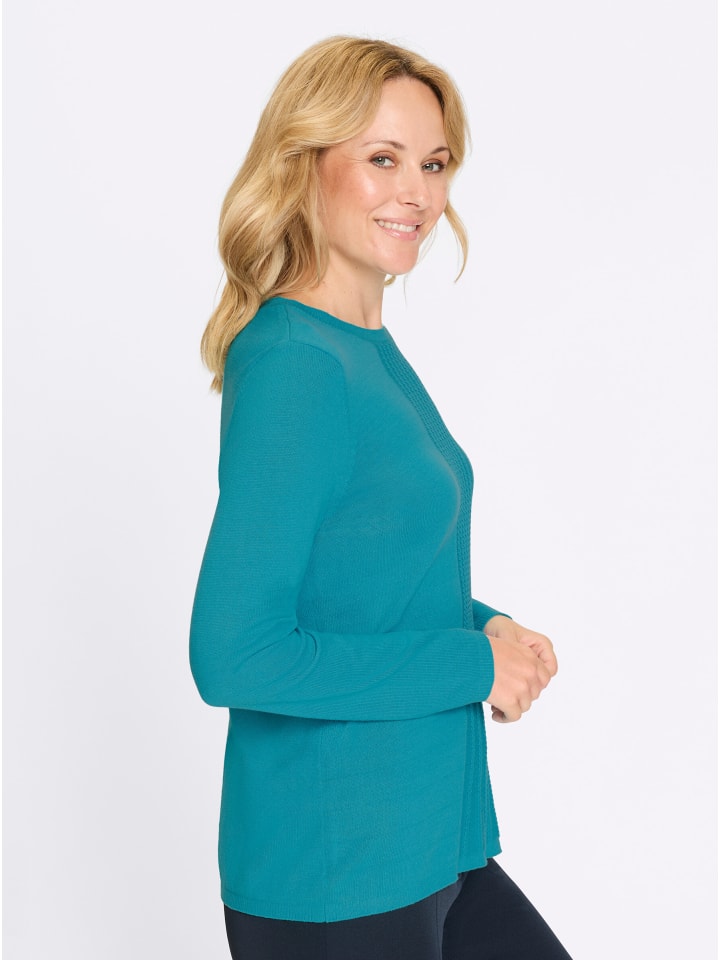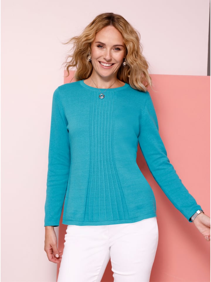 Этот приятный к телу свитер сочетает слегка расклешенный силуэт с визуально удлиняющим узором косичек спереди. Ребристая отделка на круглом вырезе, длинных рукавах и подоле.