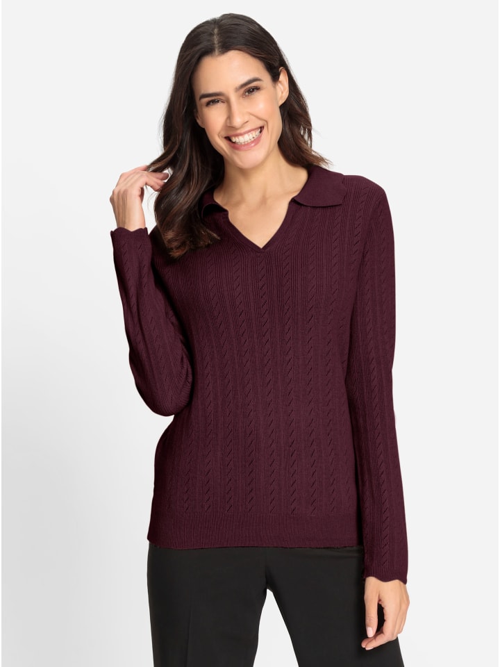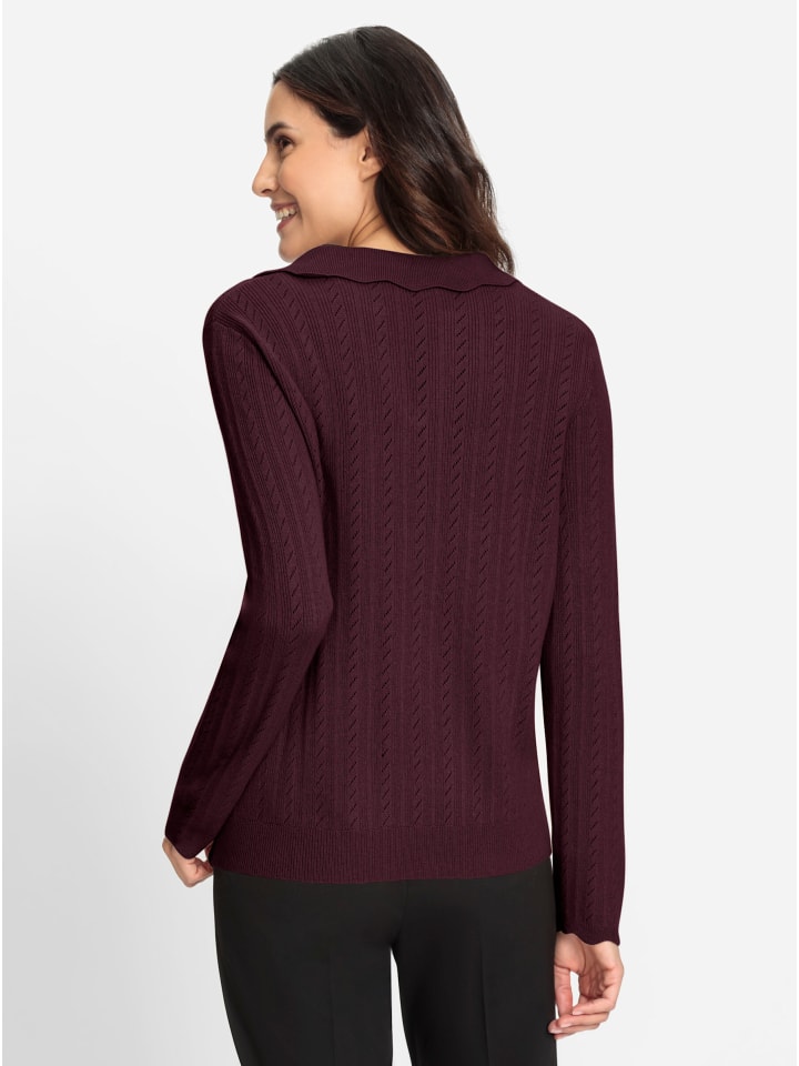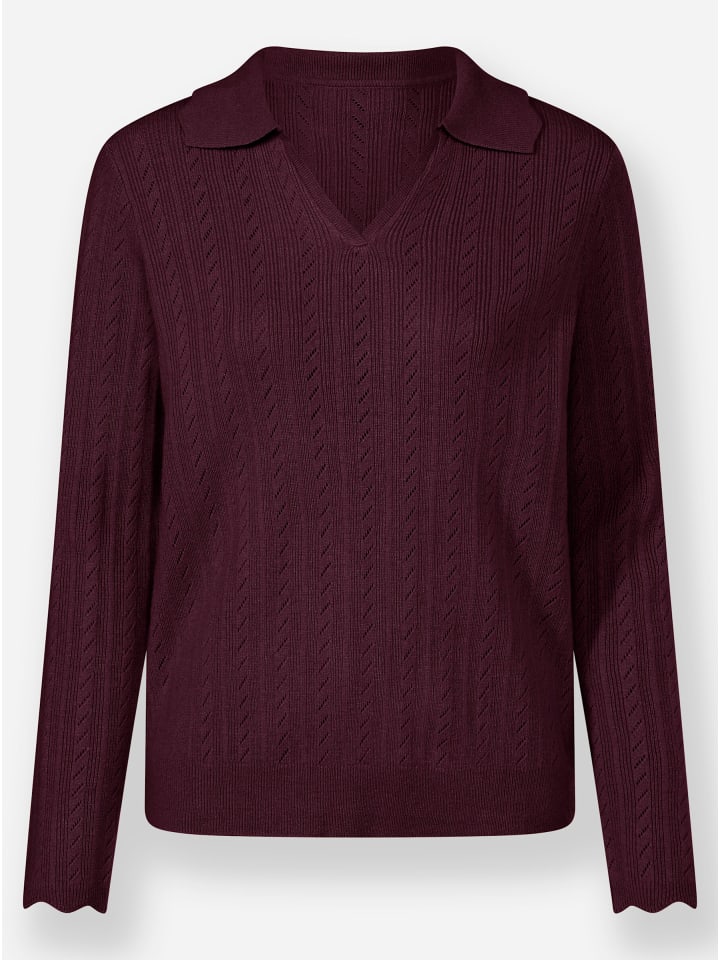 Этот спортивный свитер-поло с V-образным вырезом приобретает женственность и игривость благодаря сочетанию тонкого ажурного узора, ребристой текстуры и волнистой отделки на воротнике и длинных рукавах. Ребристый подол. Высококачественная, точная вязка. Исключительный комфорт благодаря мягкой тонкой вязке с согревающей шерстью и роскошным кашемиром.