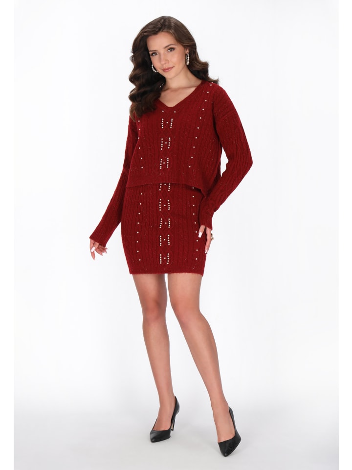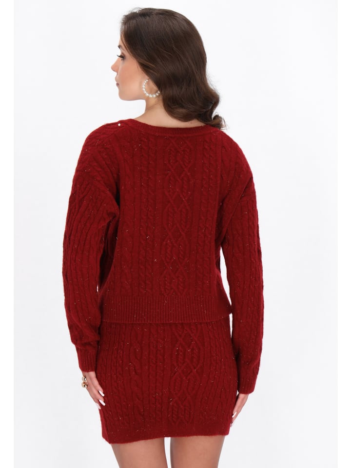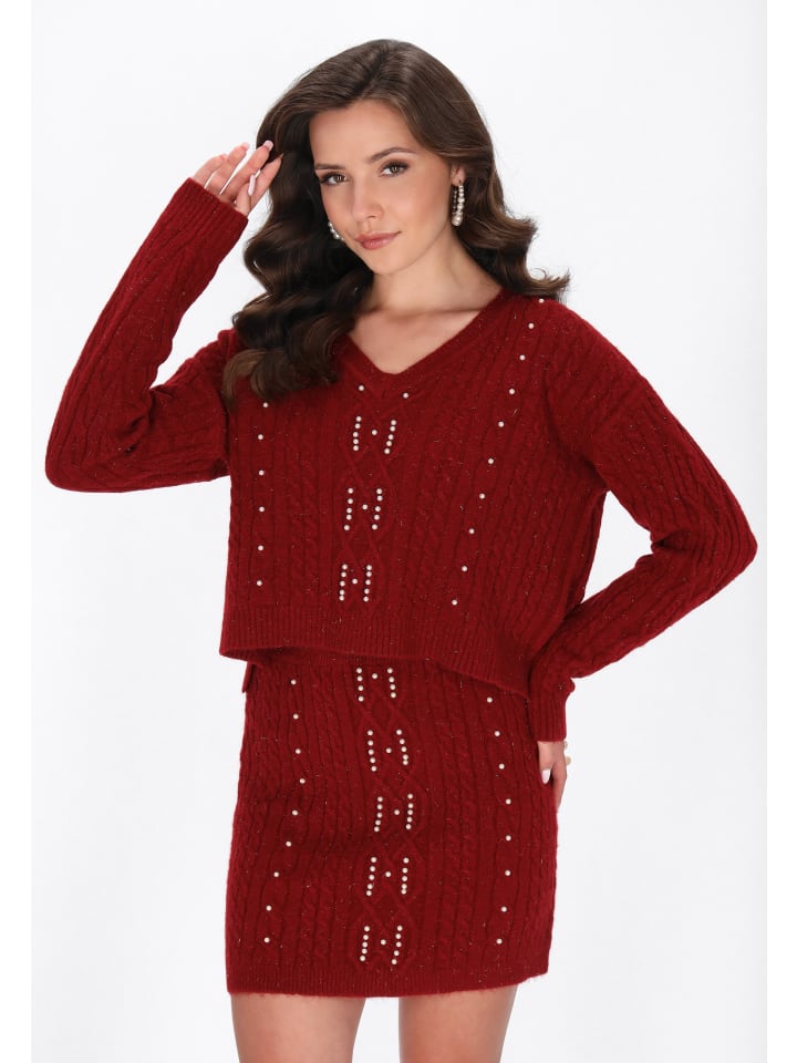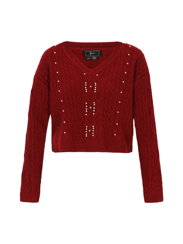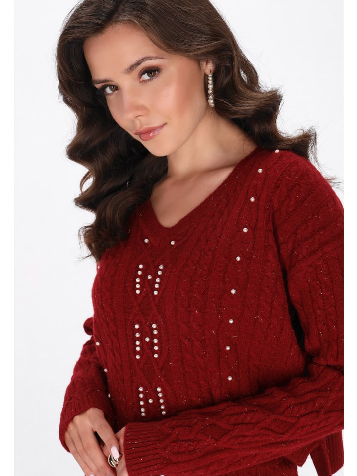 Этот модный короткий свитер - идеальный выбор для ценителей стильного комфорта. Изготовленный из мягкого трикотажа с клетчатым переплетением, он сочетает в себе классический дизайн и современные элементы. V-образный вырез слегка подчеркивает шею, а жемчужные украшения и мерцающая металлическая нить добавляют элегантности. Стандартный крой и длинные рукава обеспечивают комфортную носку, делая свитер идеальным выбором как для повседневных, так и для более женственных образов. Идеальный предмет для коллекции Fashion Look - на каждый день и для особых случаев.