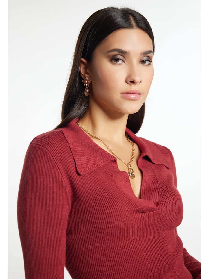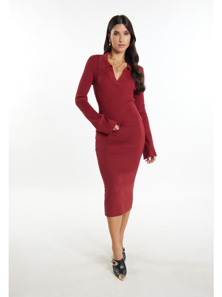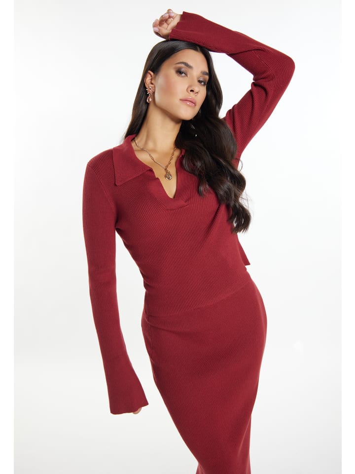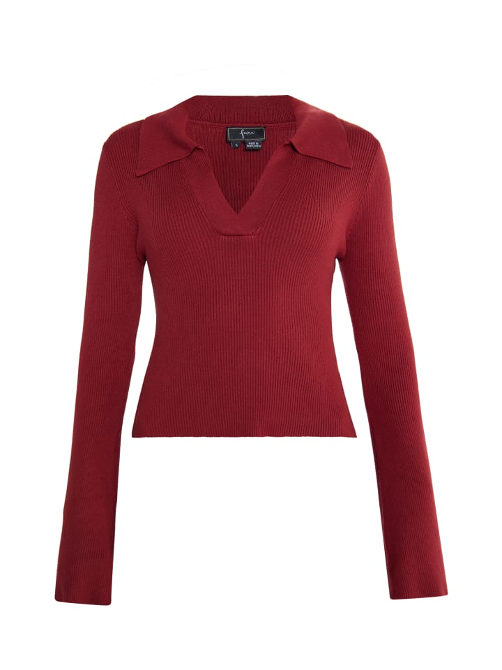 Классический и в то же время изысканный, этот свитер от Faina отличается женственным V-образным вырезом с отложным воротником и длинными рукавами с манжетами-трубами. Облегающая рубашка из вискозной пряжи в рубчик красиво драпируется. Она идеально сочетается с юбкой того же бренда.