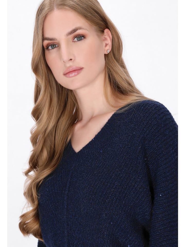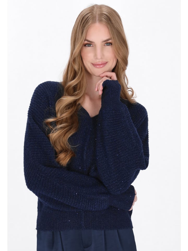 Сияйте сдержанной элегантностью в этом свободном свитере с V-образным вырезом из нашей классической коллекции. Рукава «летучая мышь», сотканные изящной металлической нитью и украшенные нежными пайетками, гармонично сочетают в себе классический стиль и легкий блеск. Этот свитер из мягкого трикотажа с простым узором обеспечивает непринужденный комфорт и изысканный стиль - идеально подходит для добавления нотки стиля в повседневные образы.