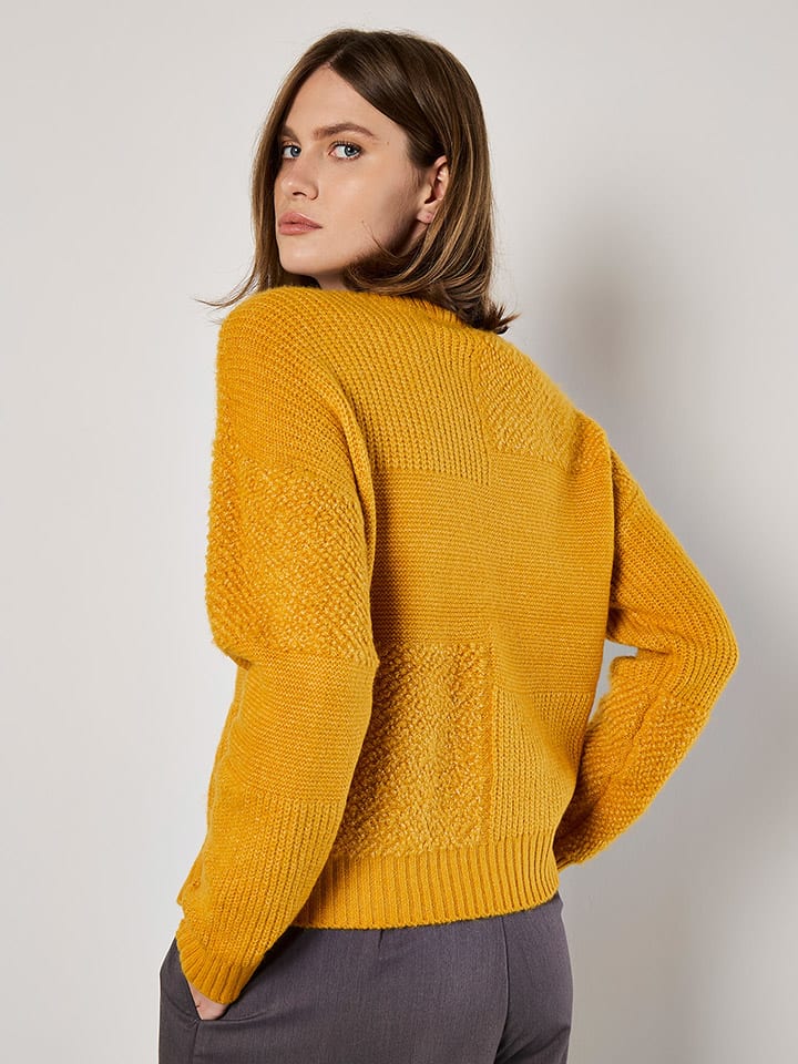 - Ребристая вязка: Вырез горловины, манжеты, низ