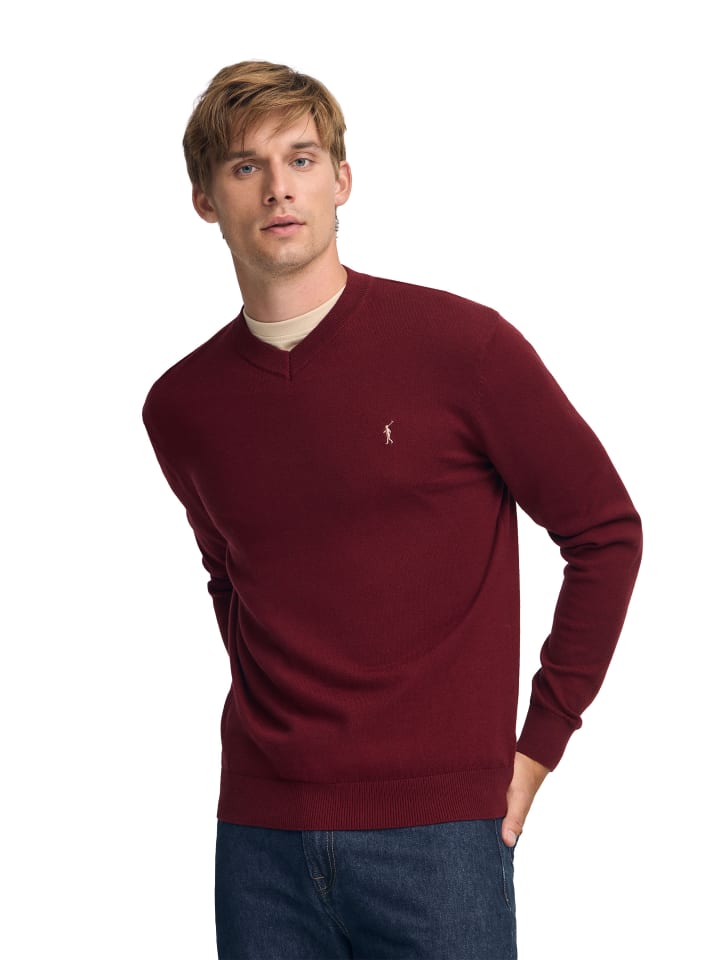 Мужской свитер прямого кроя с длинными рукавами и V-образным вырезом. Ткань из смеси шерсти и хлопка обеспечивает комфорт и тепло.
