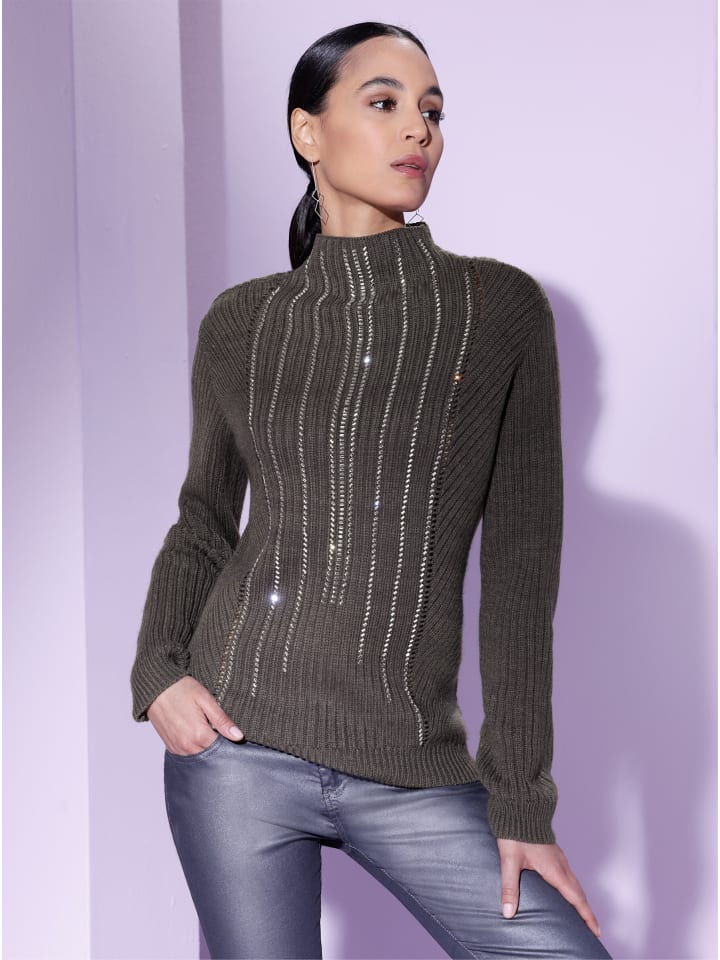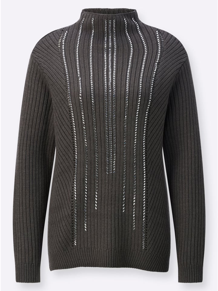 Ажурные детали, диагональная и продольная резинка, а также мерцающие серебристые пайетки придают этому свитеру из шерсти мериноса особую привлекательность. Он дополнен защитным воротником-стойкой и резинкой на длинных рукавах и манжетах по подолу. Приятный, мягкий и теплый.