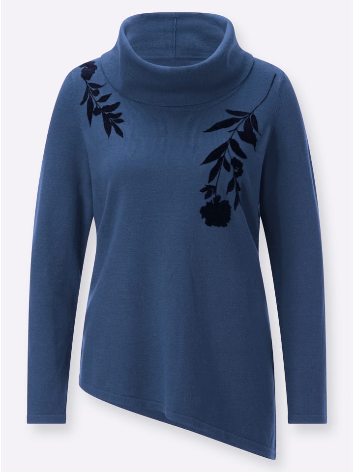 Прекрасный свитер тонкой вязки с удобным, свободным воротником-стойкой и длинными рукавами. Бархатистый ворсистый рисунок спереди. Асимметричный подол подчеркивает фигуру. Тщательно связан по фигуре. Изготовлен из вискозы Lenzing ECOVERO.