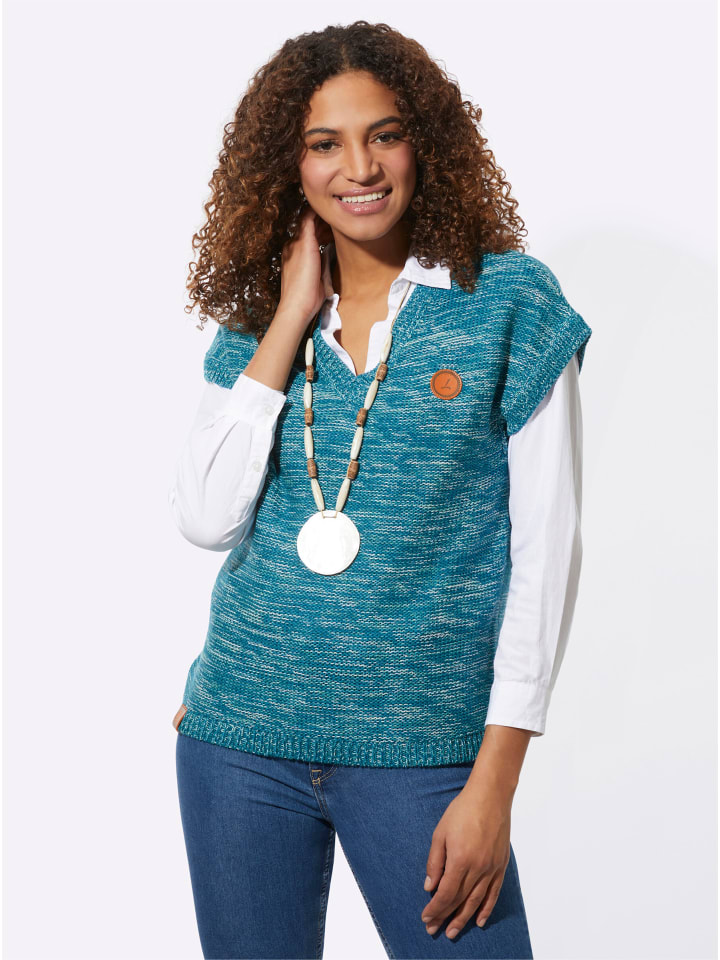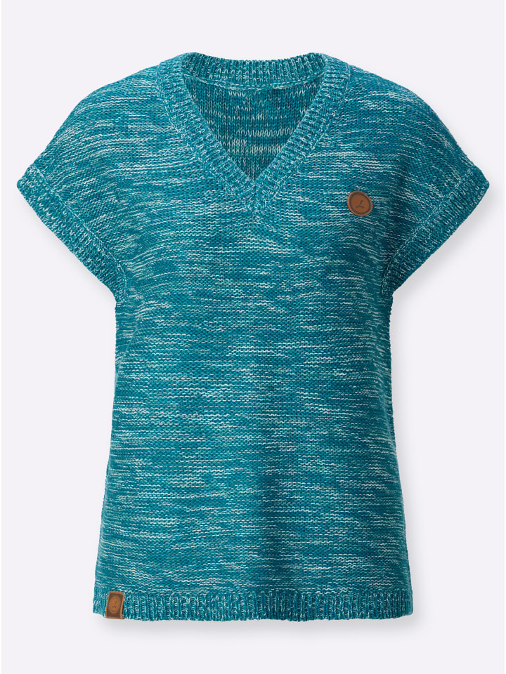 Вязаный наизнанку, высококачественный меланжевый дизайн: жилет с V-образным вырезом, спущенными плечами и ребристыми манжетами и подолом. Поддерживает инициативу «Хлопок, сделанный в Африке».