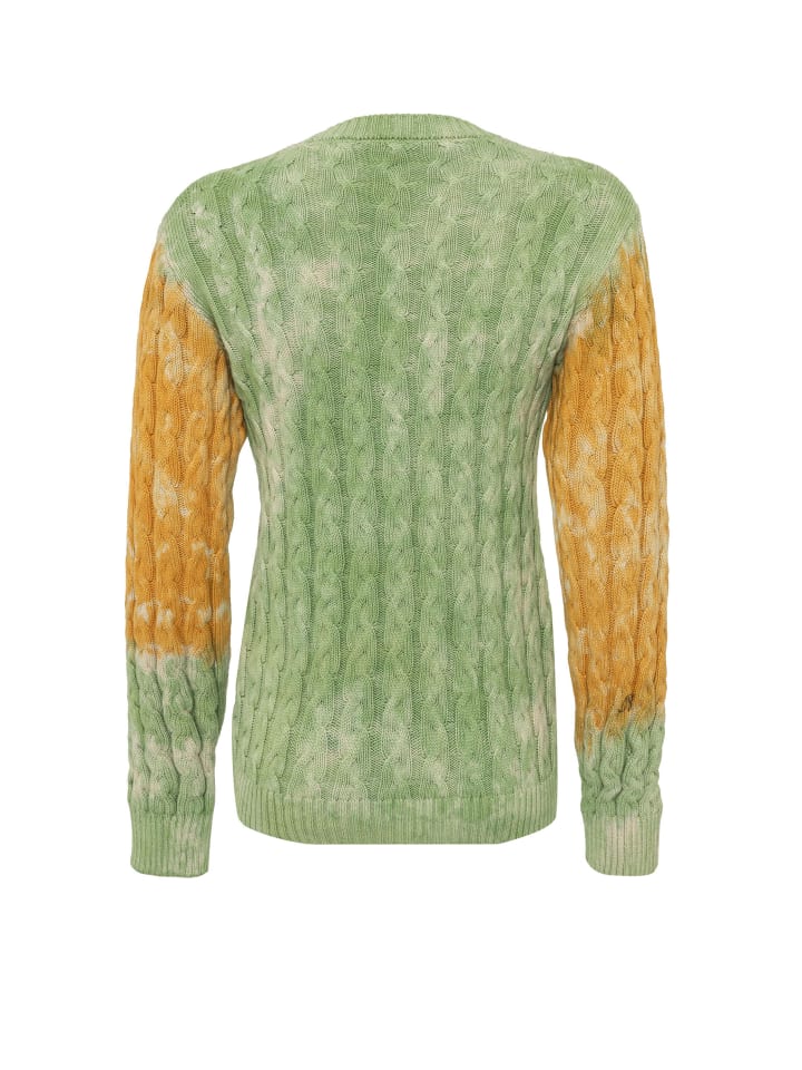Дизайн: Вязаный трикотаж с элементами цветовых блоков, круглый вырез горловины
