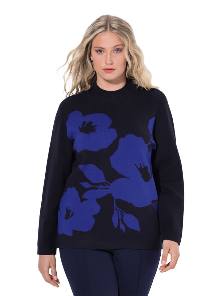 Свободный свитер из приятной эластичной жаккардовой пряжи на основе вискозы с цветочным узором - высококачественная вязка, без торчащих ниток на изнанке. Воротник-стойка, длинные рукава. Гладкие края, боковые разрезы для дополнительного комфорта.