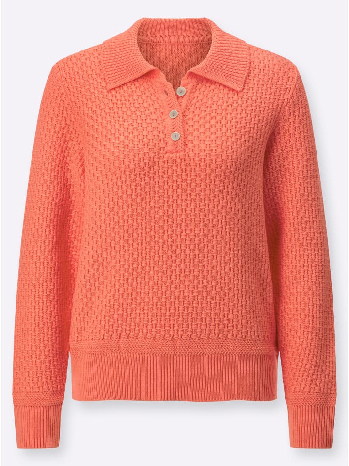 Свитер с непринужденным ребристым воротником-поло и декоративной планкой с пуговицами отличается невероятно комфортным качеством. Изящно выполнен из трикотажной ткани. Рукава с ребристыми вставками из постоянно эластичной нити. Ребристый низ.