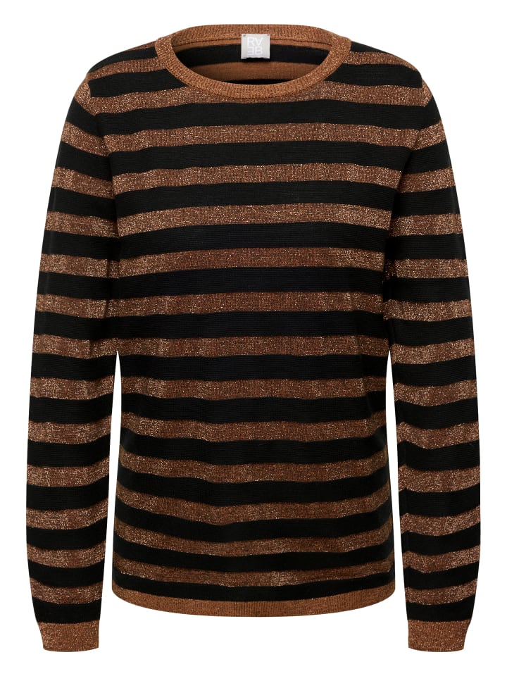 - Тонкий трикотажный свитер с блестящими полосками и круглым вырезом горловины