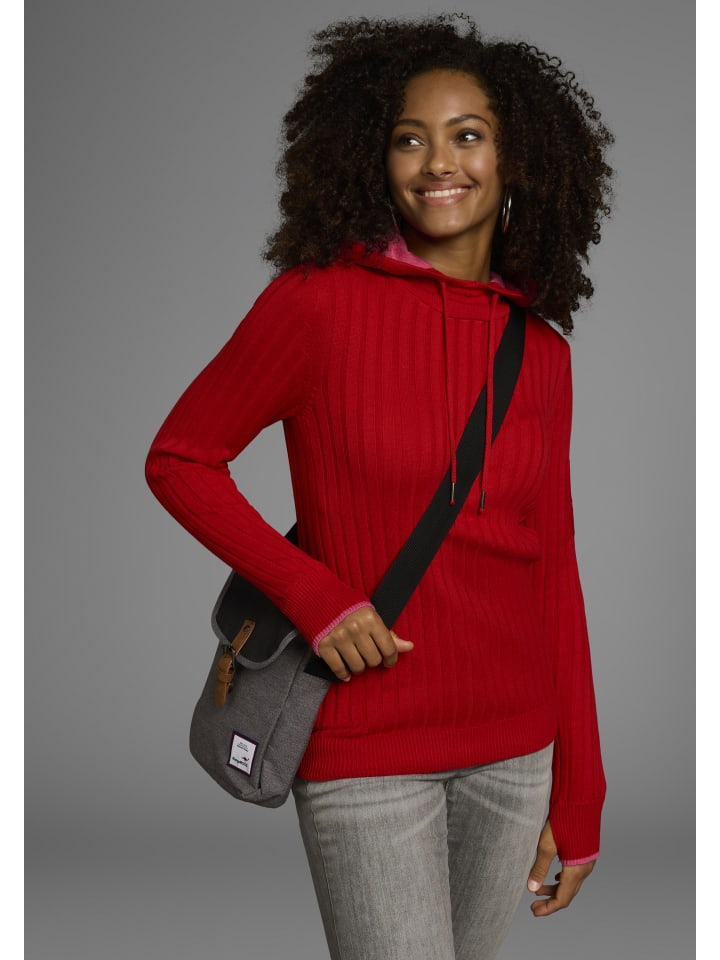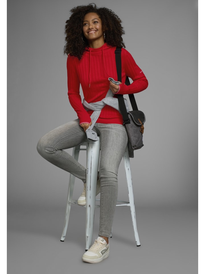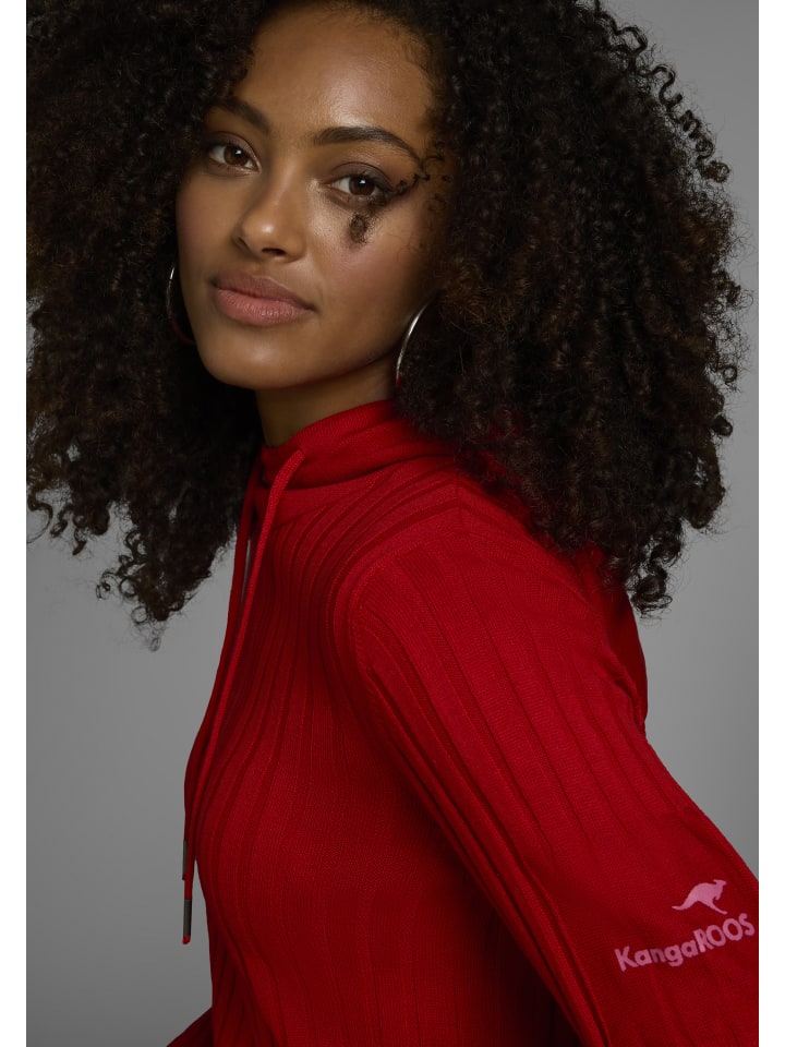 Универсальный женский трикотажный свитер от KangaROOS с контрастными деталями. Приталенный крой до бедер и длинные рукава. У свитера также есть практичный капюшон на завязках. Высокая эластичность трикотажного полотна в рубчик делает этот топ исключительно удобным.