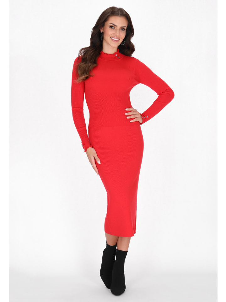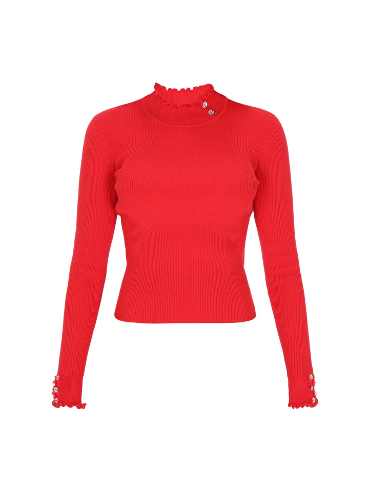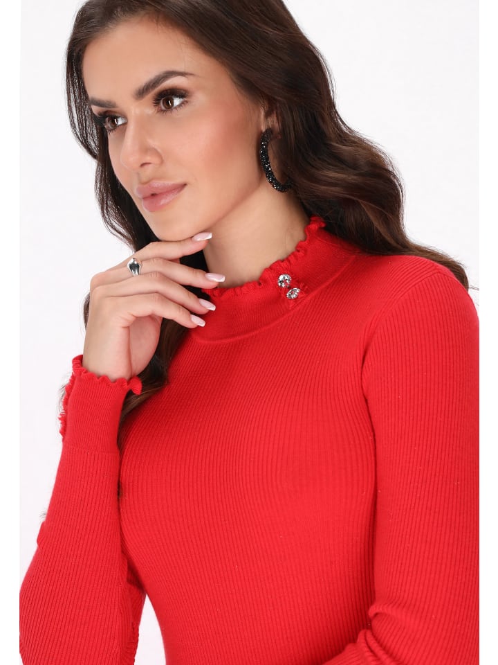 Подчеркните свой стиль с этим приталенным свитером с воротником-стойкой и длинными рукавами. Оборка и декоративные пуговицы подчеркивают элегантность, а гладкий крой делает его универсальным. Эта удобная модель из трикотажного полотна в рубчик идеально подходит для создания элегантного и в то же время повседневного образа. Этот свитер входит в коллекцию Fashion Look.