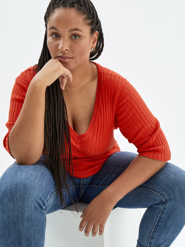 Красивый трикотажный топ с ребристой текстурой. Он имеет V-образный вырез, рукава три четверти и изготовлен на 75% из экологически чистых материалов. Цвет идеально подходит для весны.