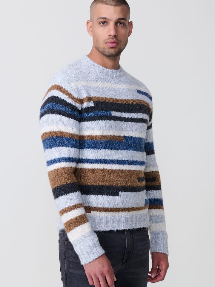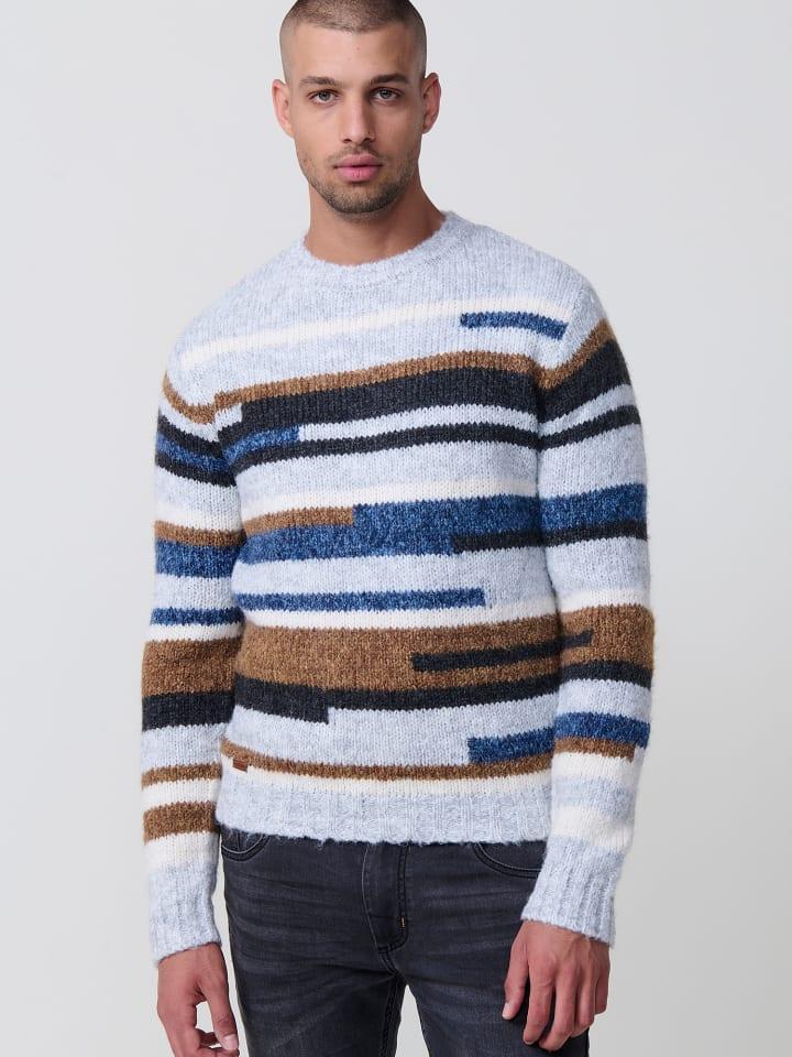Полосатый трикотажный свитер. Длинные рукава и круглый вырез горловины. Состав: 77% полиэстер, 23% акрил