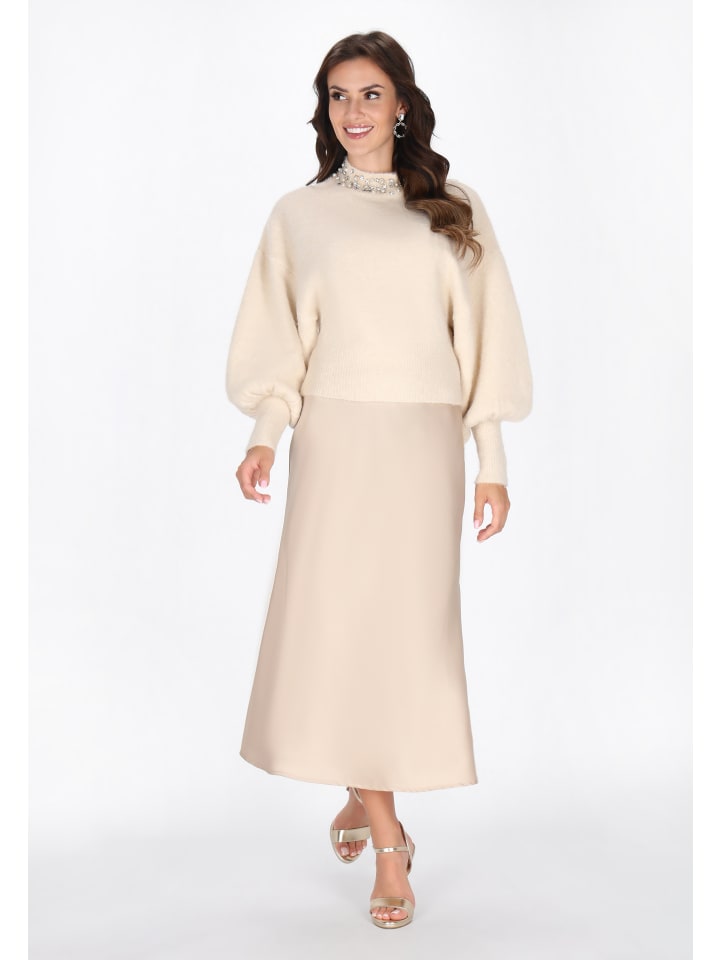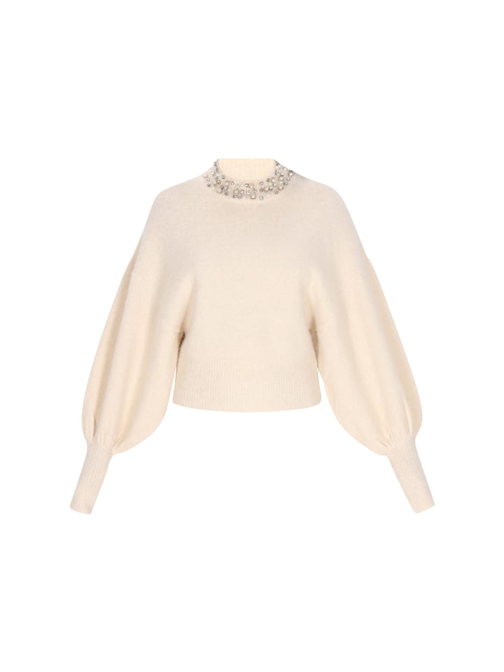 Этот уникальный свитер из коллекции Fashion Look сочетает в себе комфорт и женственную элегантность. Свободный крой и спущенная линия плеча обеспечивают максимальный комфорт и свободу движений. Стильный воротник-стойка добавляет современный штрих к общему образу, а эффектные рукава добавляют легкости и оригинальности силуэту. Свитер украшен нежным жемчугом, который добавляет элегантности и женственности. Изготовленный из мягкого трикотажа с гладким переплетением, он идеально подойдет как для повседневной носки, так и для особых случаев.