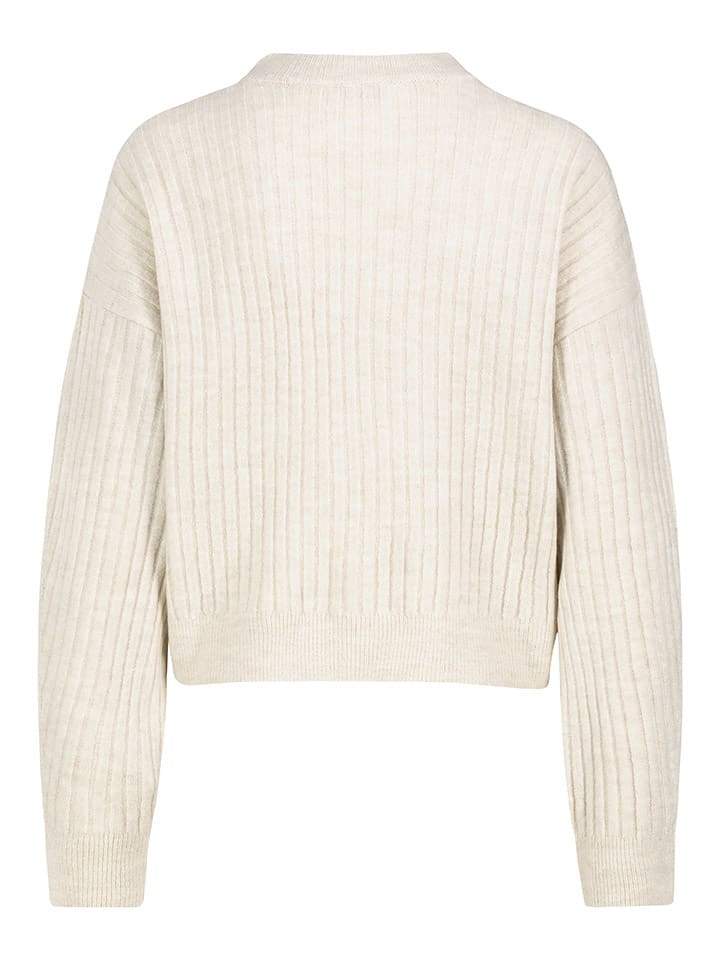 - Ребристая вязка: Вырез горловины, манжеты, подол