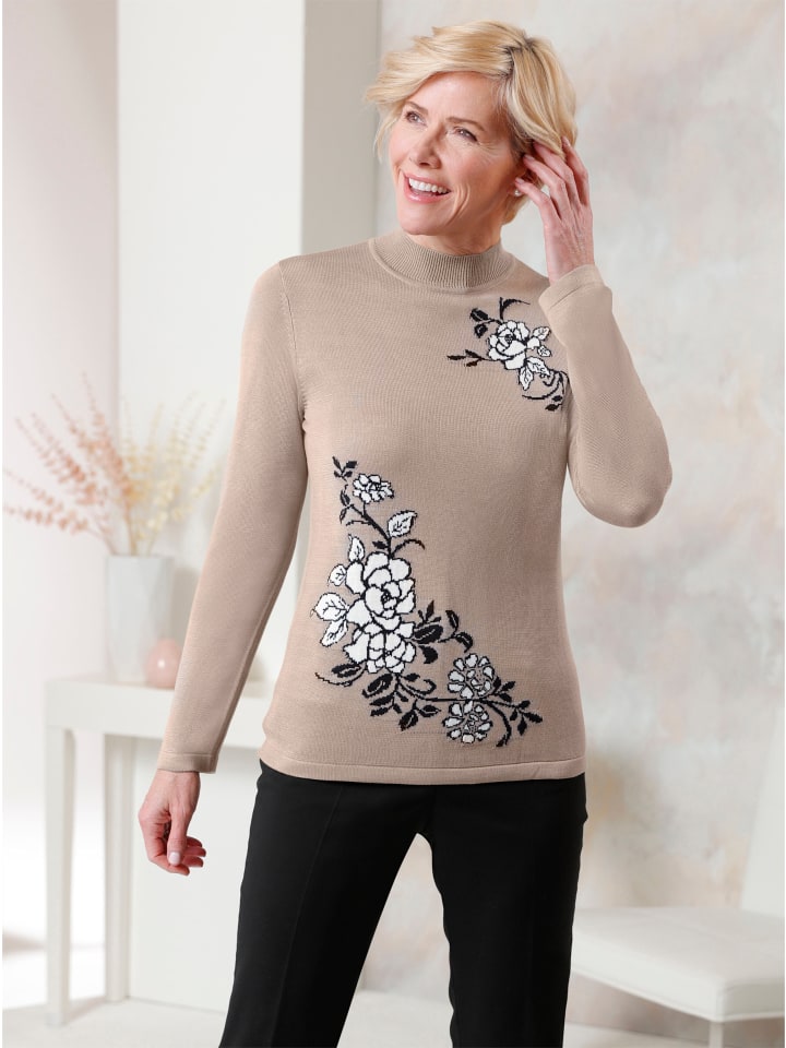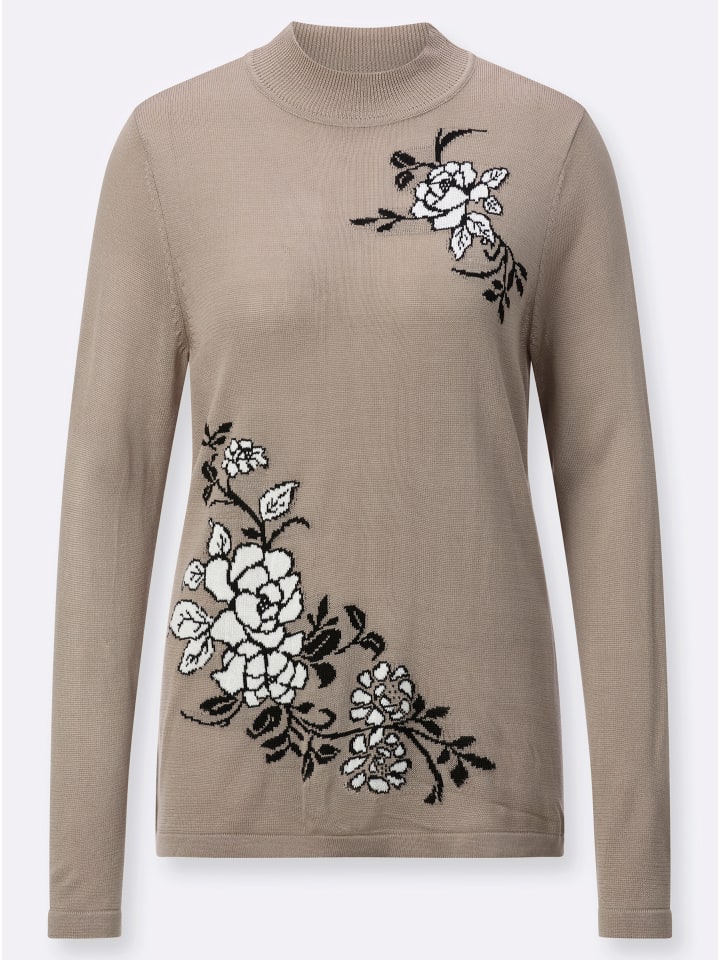 Мягкий свитер с воротником-стойкой, выполненный из ткани, не требующей особого ухода. Сложная вязка обеспечивает идеальную посадку.