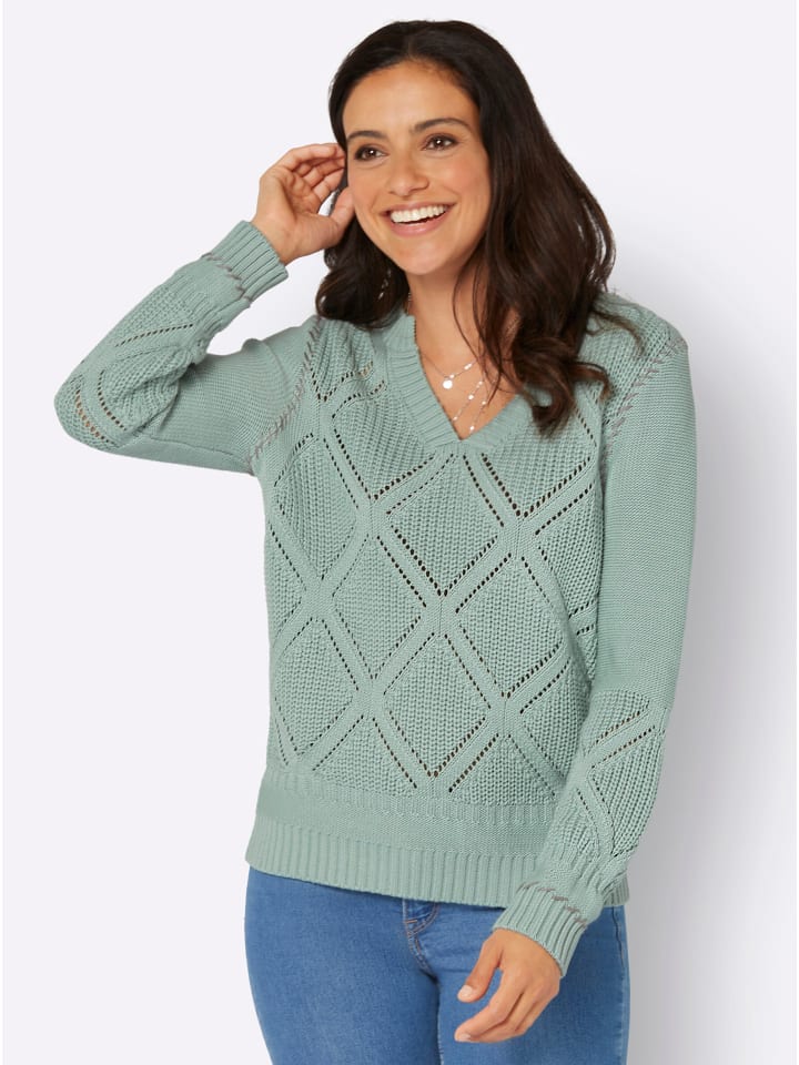 Ажурная ромбовидная вязка по всему изделию придает свитеру спортивный характер. Ребристая отделка на комбинированном круглом/V-образном вырезе, длинных рукавах и подоле. Контрастные декоративные швы на притачных рукавах и манжетах добавляют акценты.