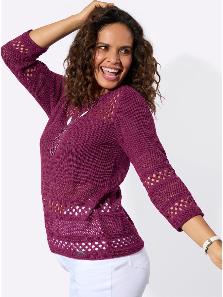 Приятно мягкий и простой в уходе: ажурный свитер с разнообразными узорами вязки по всему периметру. Декоративная отделка края круглого выреза, рукавов 3/4 и подола. Сертифицировано OCS.