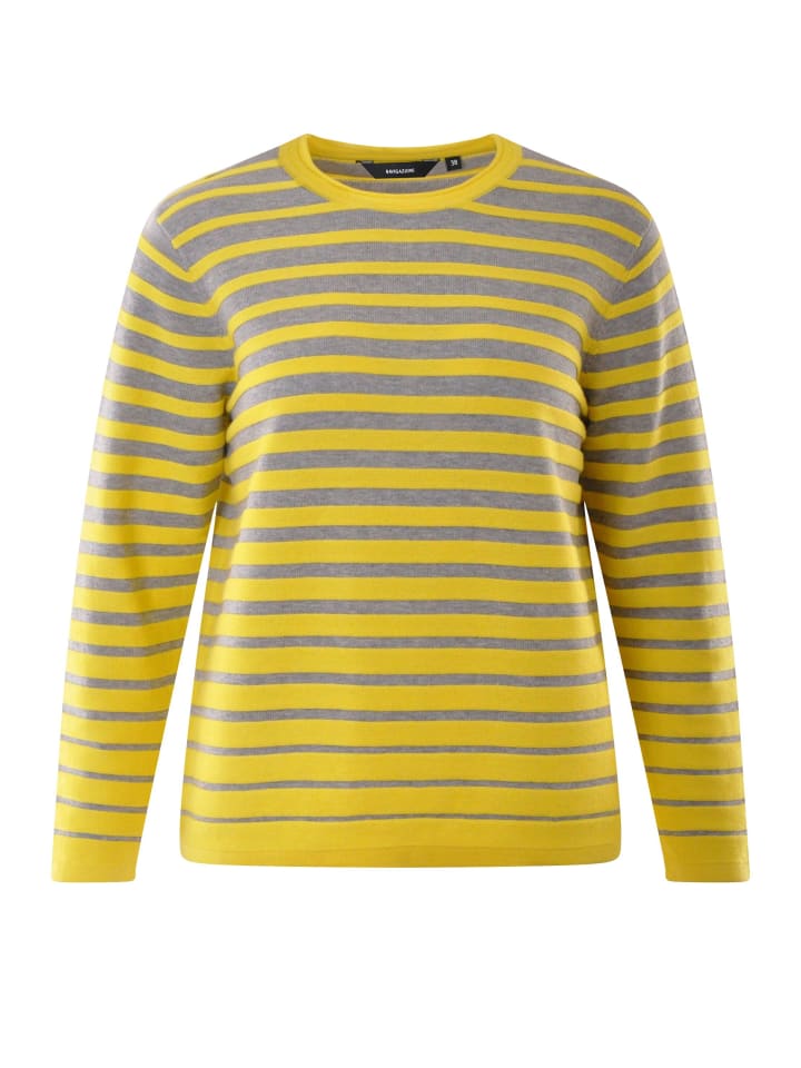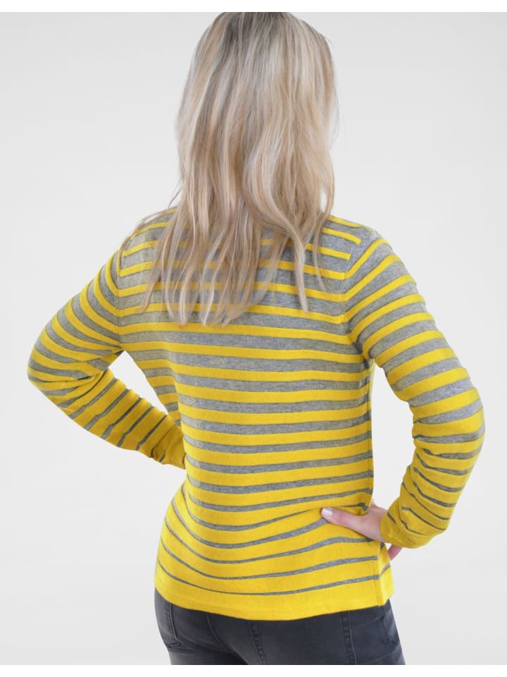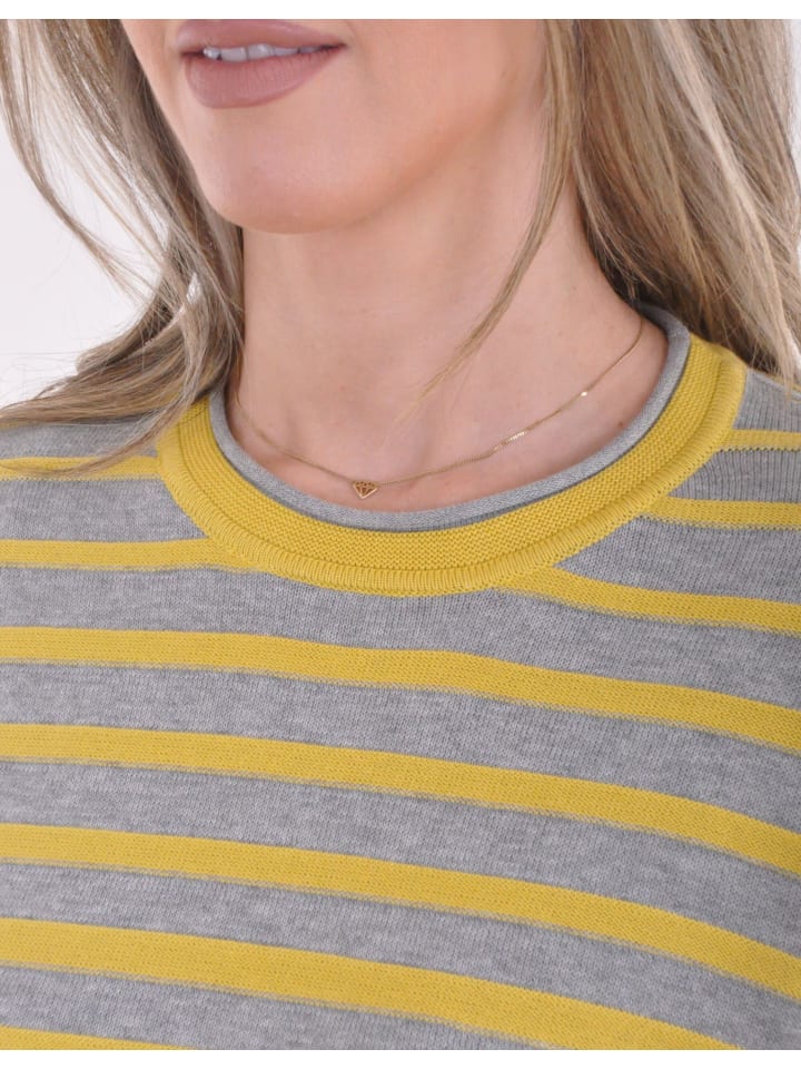 Этой зимой вам просто не обойтись без свитера NAVIGAZIONE! Его двухцветный дизайн, сочетающий свежий желтый и мягкий светло-серый цвета, наполнит ваше сердце солнечным светом даже в самые холодные дни. Полоски на фактурной ткани добавляют ярких ноток и создают непринужденный образ. Благодаря прямому крою свитер обеспечивает исключительный комфорт. Привлекательная деталь - подвернутый край горловины. Этот универсальный предмет одежды можно носить как с джинсами и ботинками, так и с брюками и ботильонами.