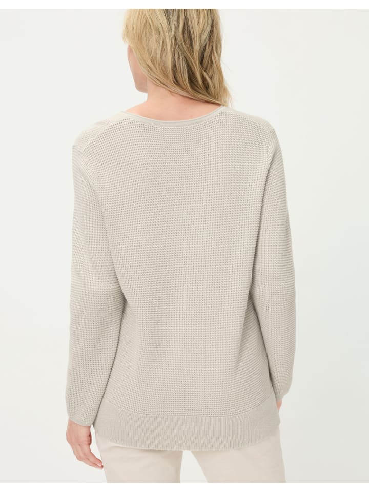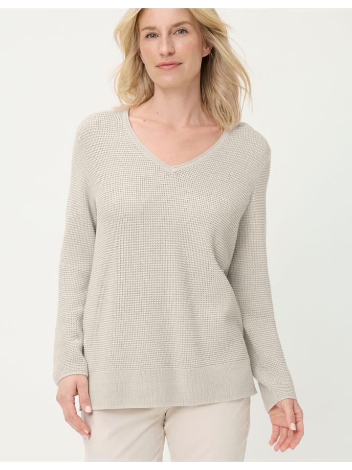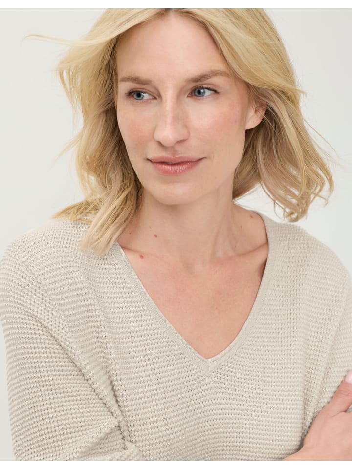 Благодаря стильной фактуре вязки и женственному V-образному вырезу этот свитер добавит нотку свежести в ваш гардероб. Прямой крой и приятная мягкая ткань обеспечивают комфорт, а небольшие разрезы по бокам придают образу современную легкость. Универсальный вариант на каждый день и в офис. Длина около 60 см.
