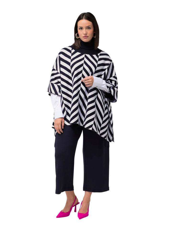 Вязаная накидка, широкое пончо из мягкой тонкой вязки с графическим жаккардовым узором черно-белой расцветки. Мягкий, ребристый воротник, широкие спущенные плечи.
