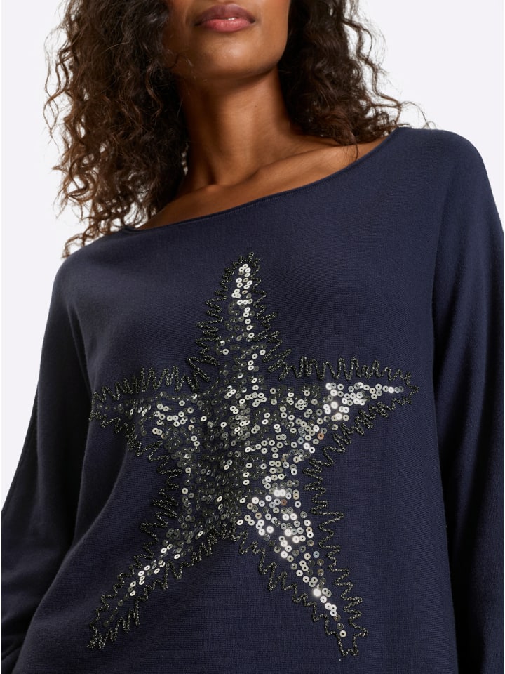 Привлекающий внимание свитер спереди: стратегически расположенная аппликация в виде звезды с пайетками. Круглый вырез горловины и модные рукава «летучая мышь». Изготовлен из вискозы Lenzing ECOVERO.