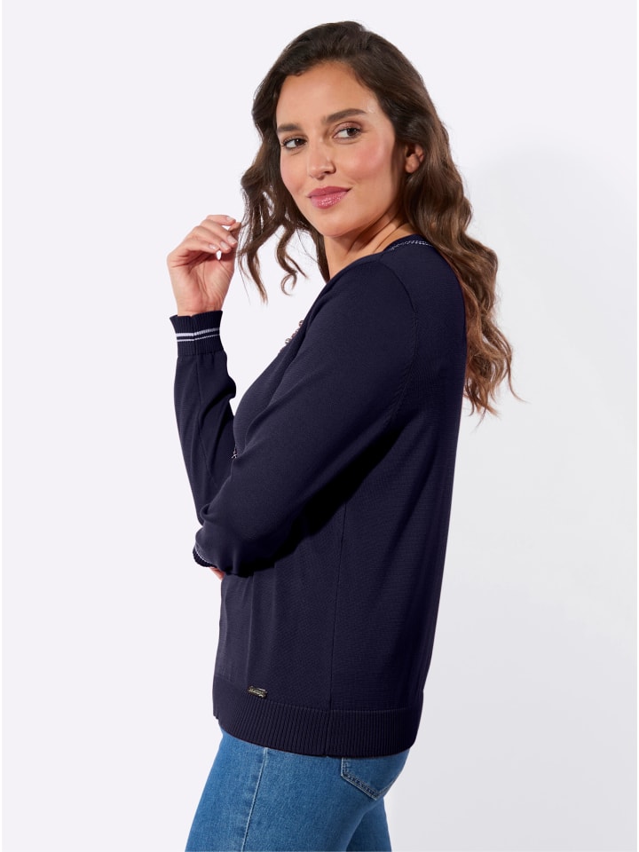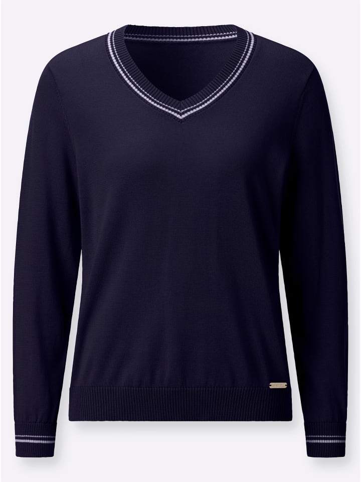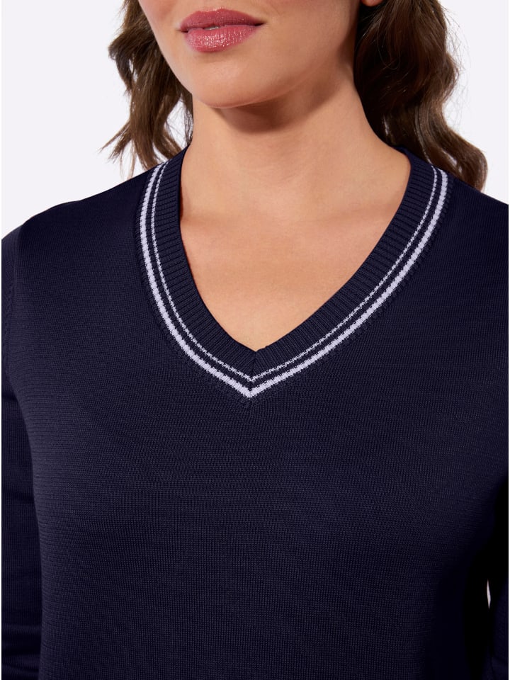 Каждой женщине нужен такой свитер с V-образным вырезом! V-образный вырез, манжеты и подол отделаны резинкой. Модные контрастные полоски также украшают V-образный вырез и манжеты. Сертифицировано OCS.