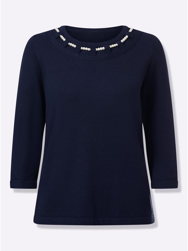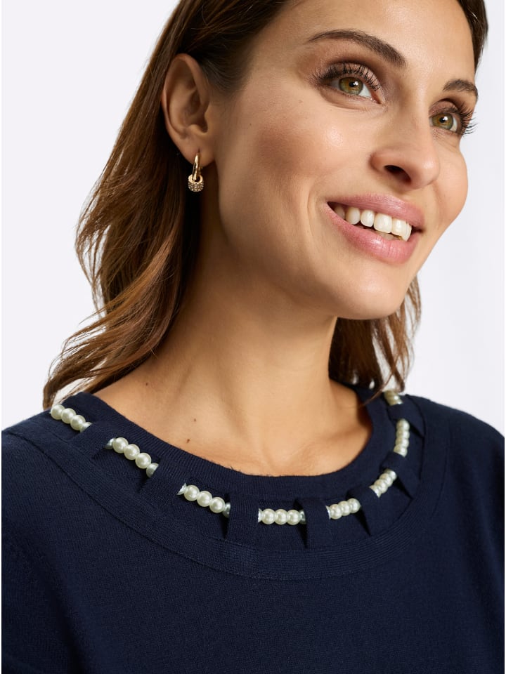 Изысканный вырез горловины с декоративным жемчужным ожерельем делает этот свитер с круглым вырезом таким особенным! Рукава 3/4. Тщательно связан для идеальной посадки. Вискоза качества ECOVERO от Lenzing.
