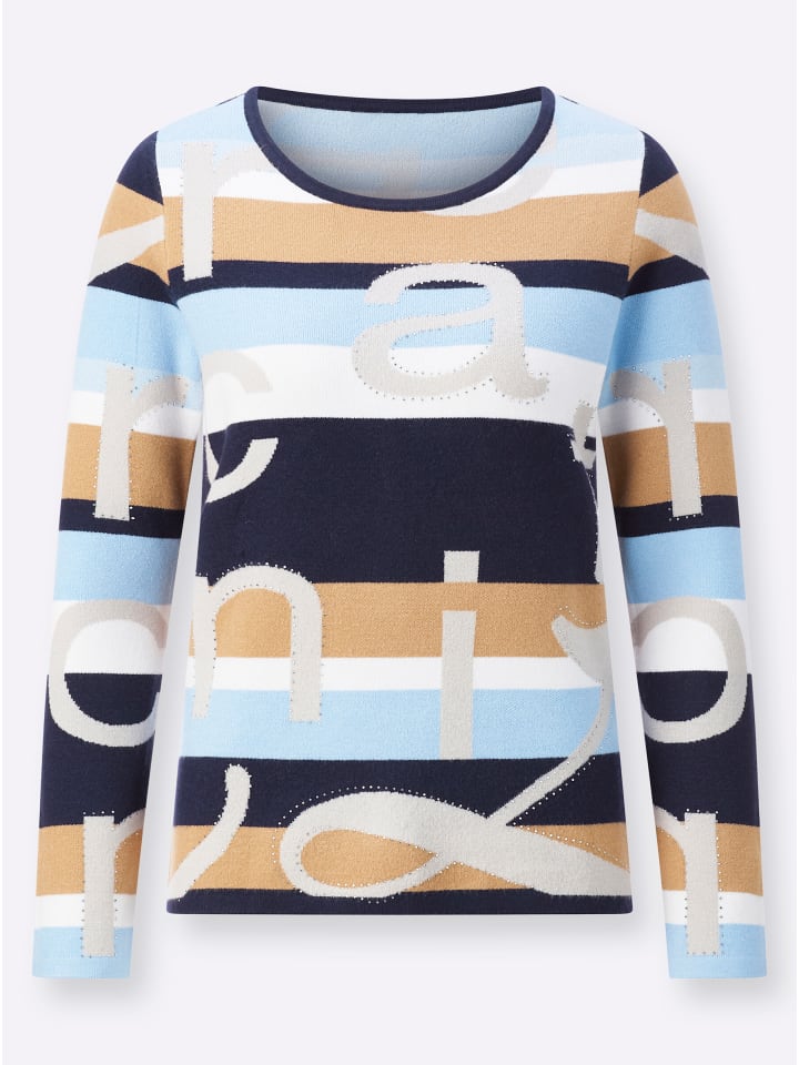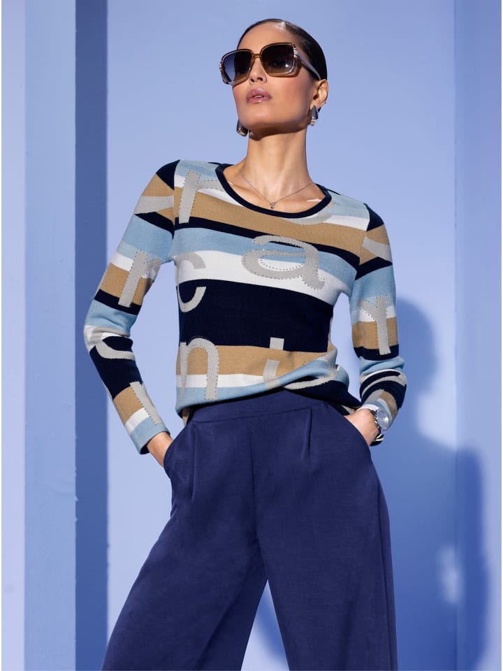 Надписи сейчас в тренде и по-новому интерпретированы на этом жаккардовом свитере из гладкой тонкой вязки с разноцветными полосками по всей поверхности. Сверкающие стразы добавляют нотку гламура спереди и на рукавах. Круглый вырез горловины и длинные рукава. Изготовлен из вискозы Lenzing ECOVERO.