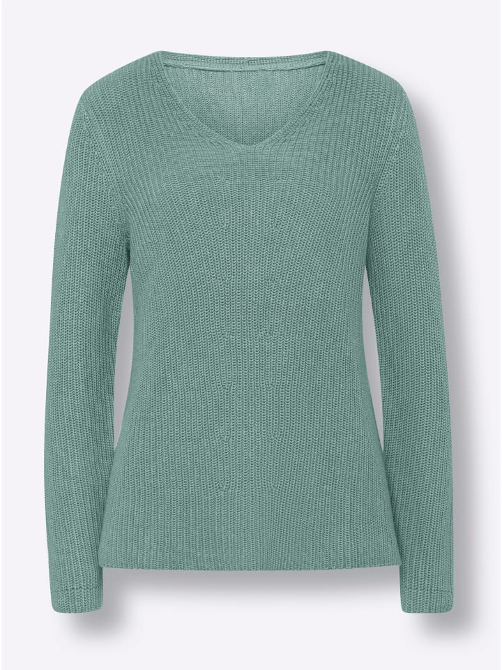 Спортивный трикотажный свитер из лакированной пряжи с привлекательными деталями. Имеет слегка закругленный V-образный вырез, длинные рукава и боковые разрезы. Слегка удлинен сзади. В соответствии с инициативой «Хлопок, сделанный в Африке».