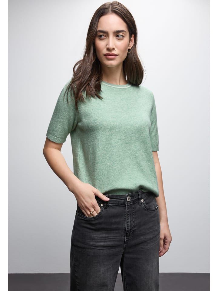 - Ребристая вязка: Вырез горловины, манжеты, подол