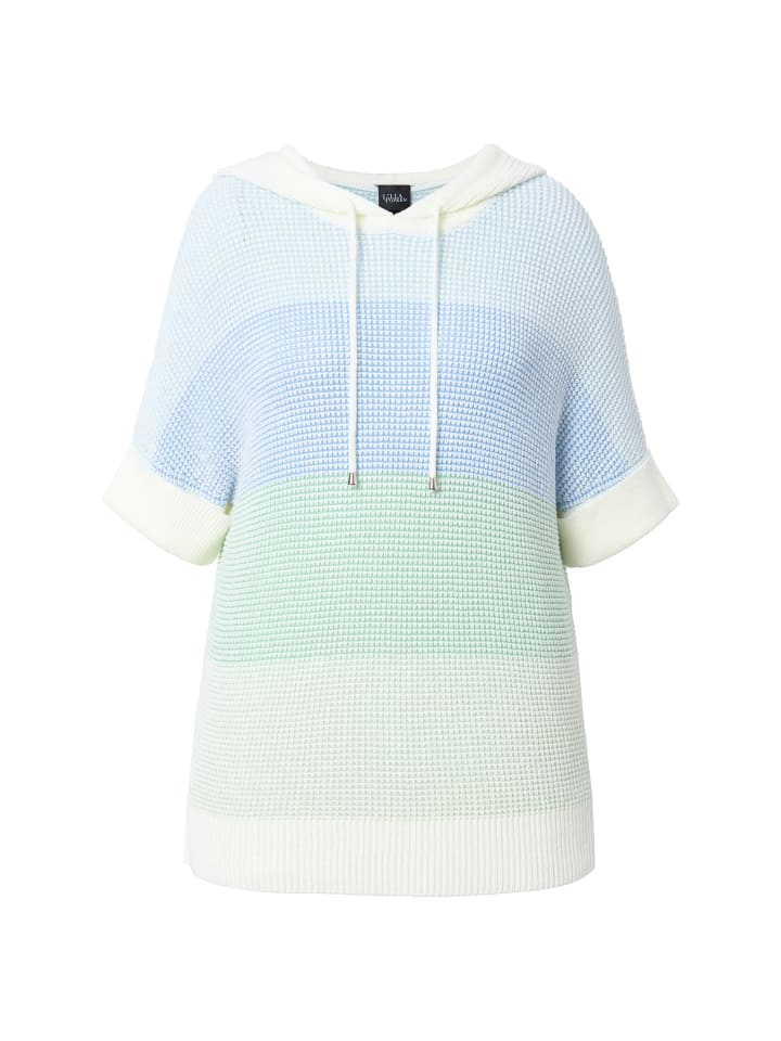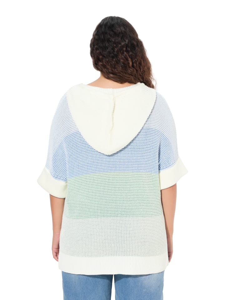 Свободный свитер фактурной вязки с двухцветными полосками и капюшоном на шнурке. Спущенная линия плеча, короткие рукава с отворотами. Ребристые манжеты, боковые разрезы.